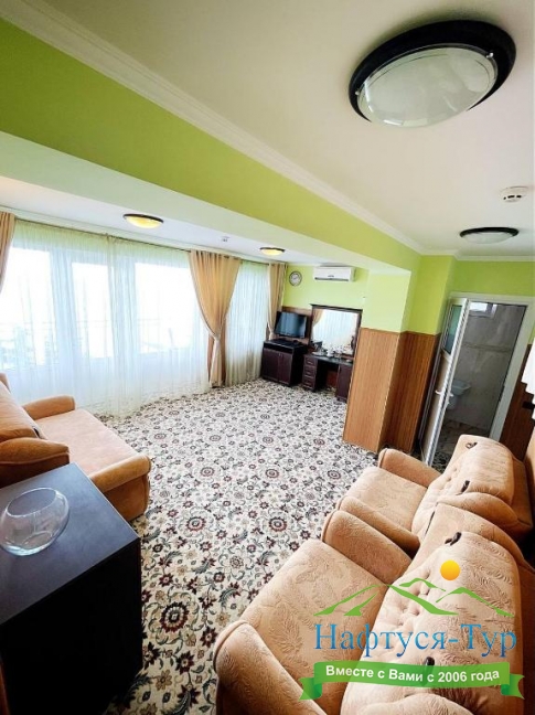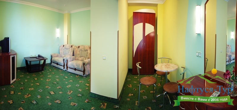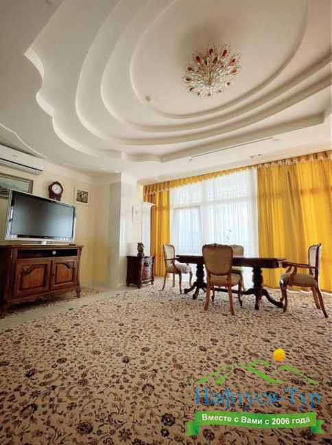 Во всех комнатах имеется двуспальная кровать, мягкая мебель, 1 или 2 телевизора, 1 или 2 кондиционера, мини-сейф, 1 или 2 санузла (душевая кабина / джакузи / ванна).