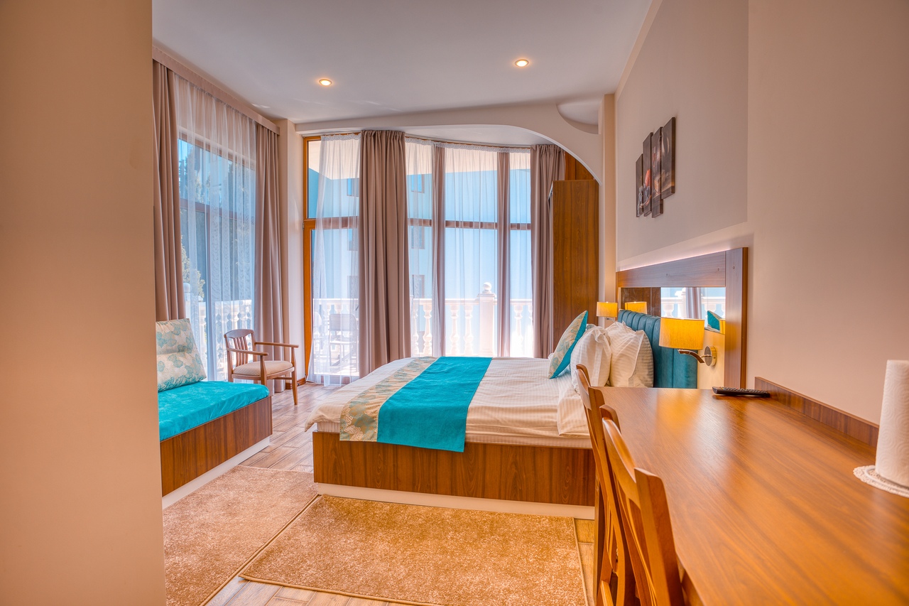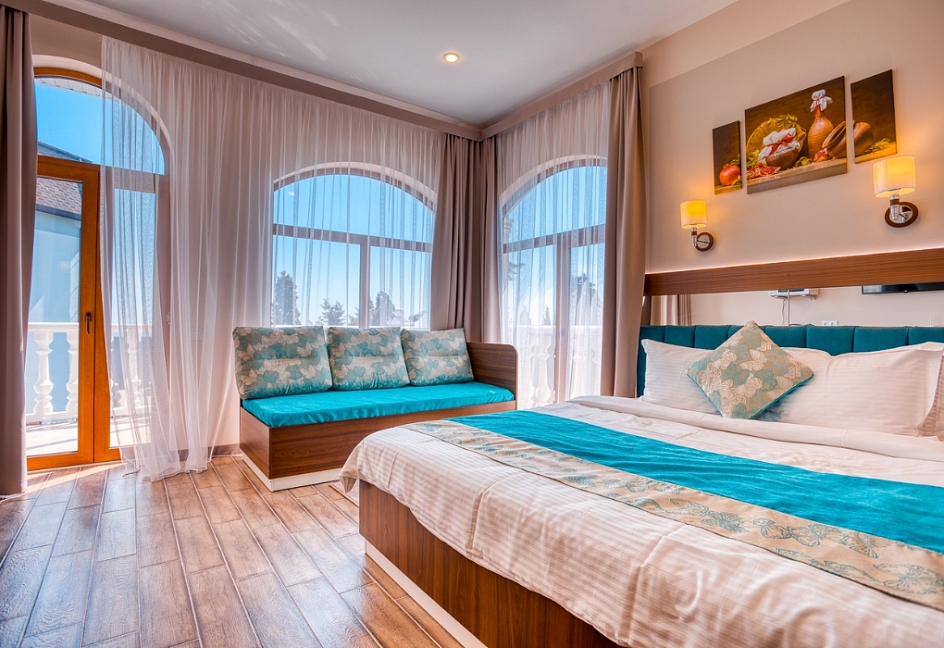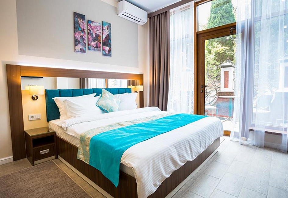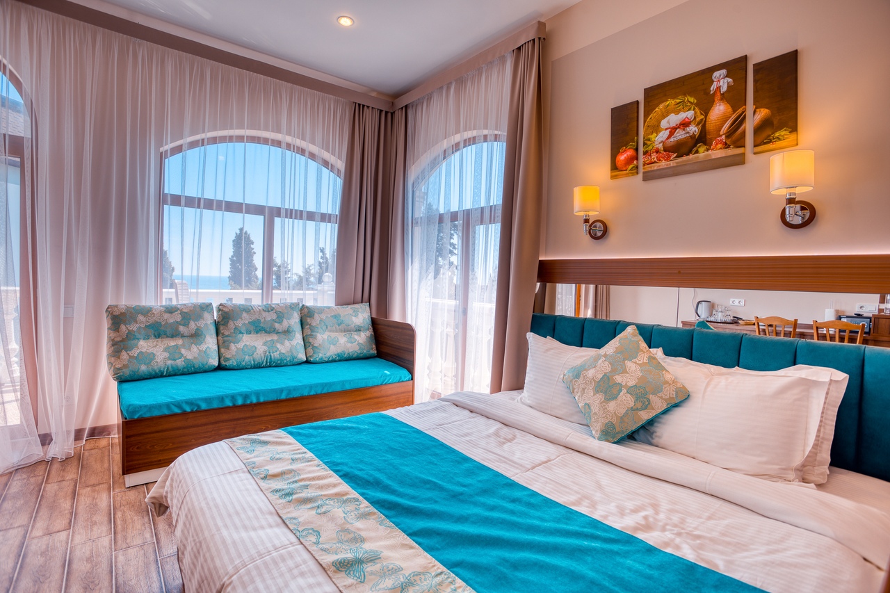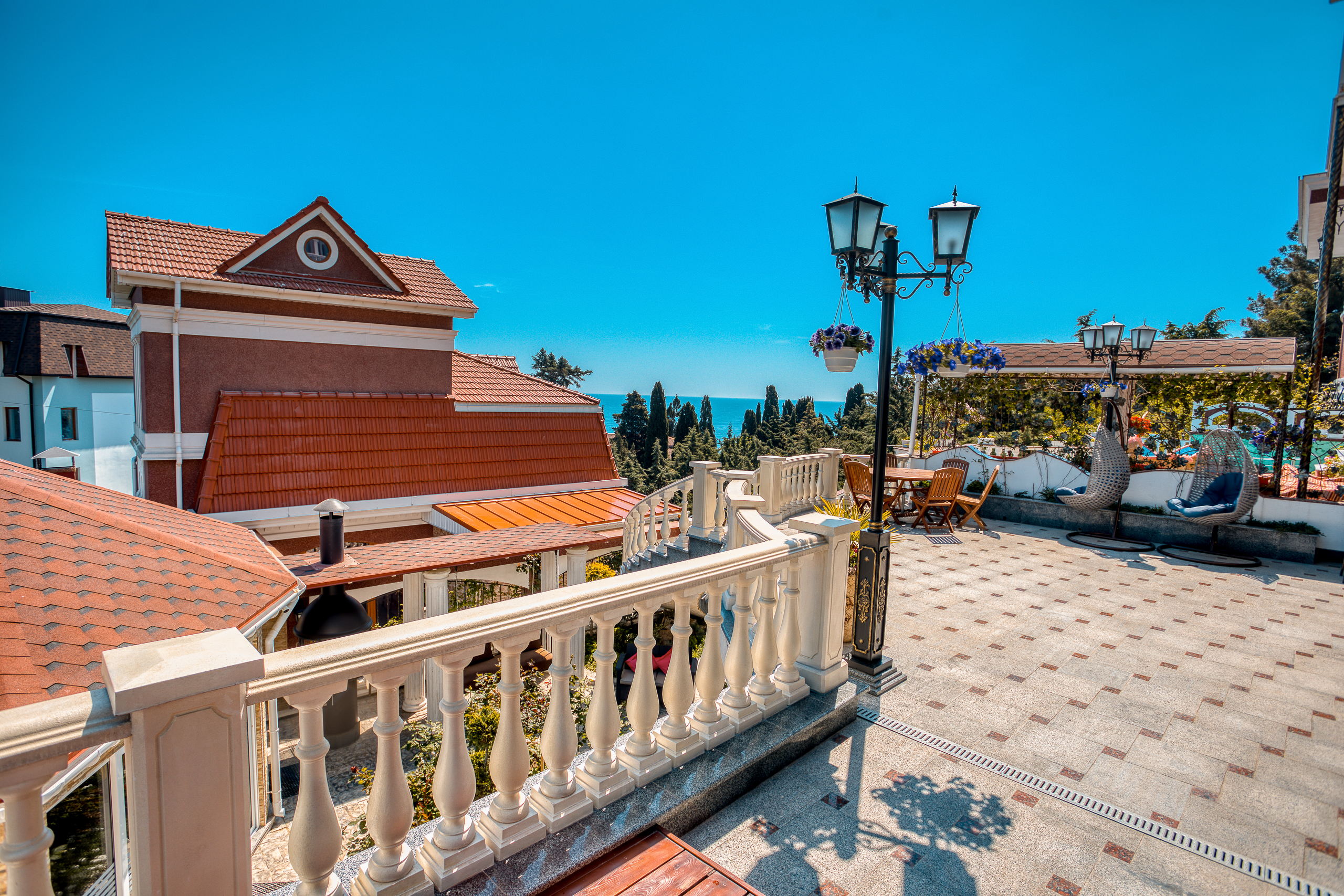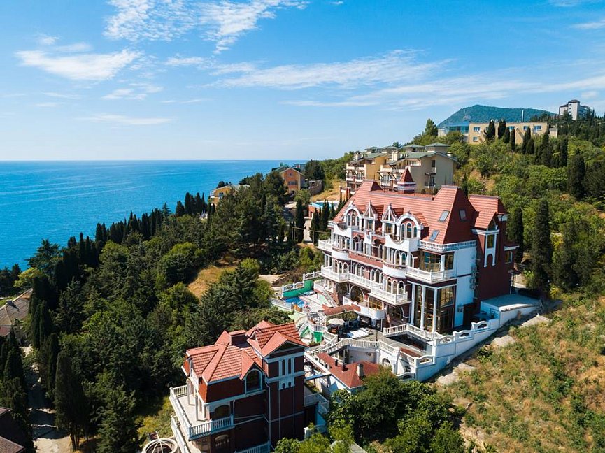 Удачное местоположение с прекрасным видом на море и горы создает условия для приватного элитного проживания и отдыха вдали от шумных дорог, но вблизи с центром курортной жизни города Алушты. До набережной от отеля можно дойти за 7 мин, в пешей доступности: магазины, кафе, столовая и многое другое.