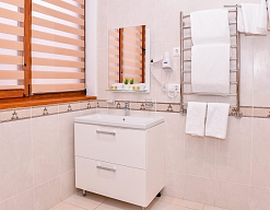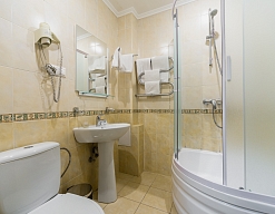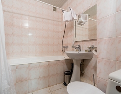 с ванной или душевой кабиной, тапочки, туалетные принадлежности, фен, халат