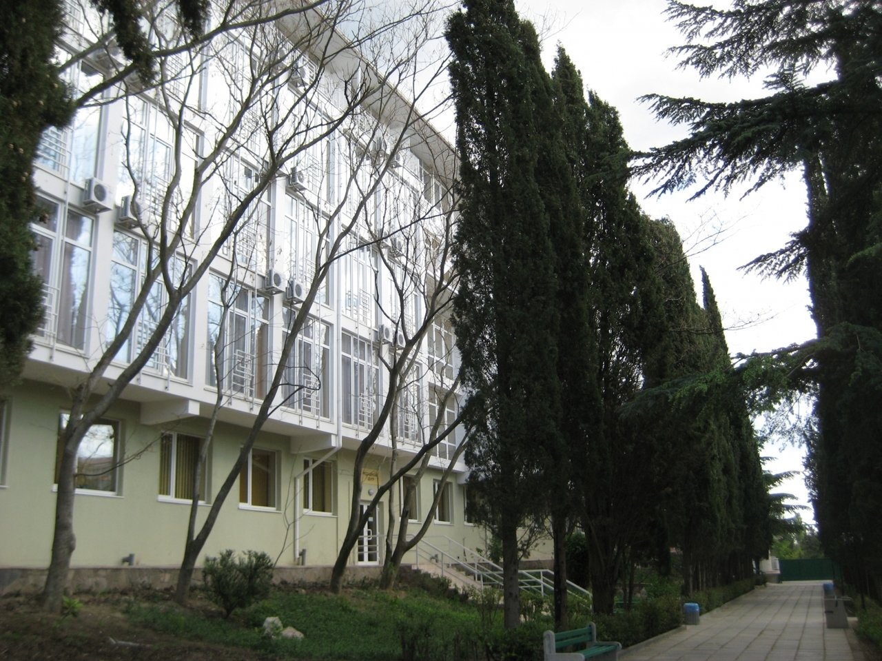 - расположен в восточной части Алушты, в парковой зоне, богатой кипарисами, магнолиями, кедрами и лекарственной акацией