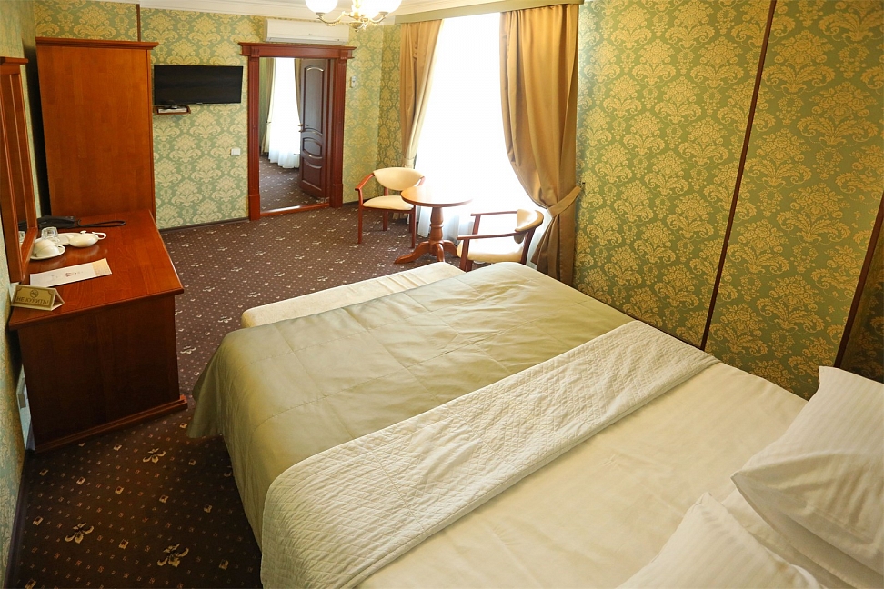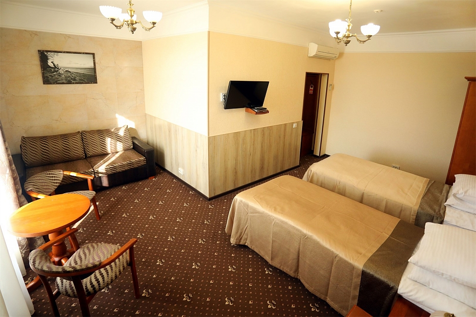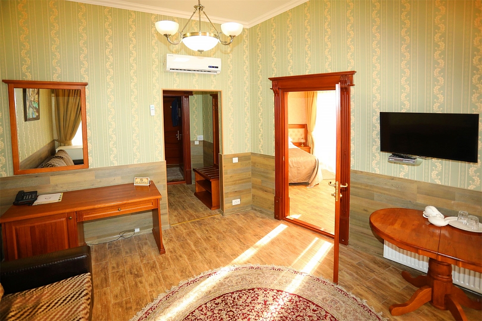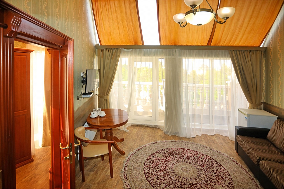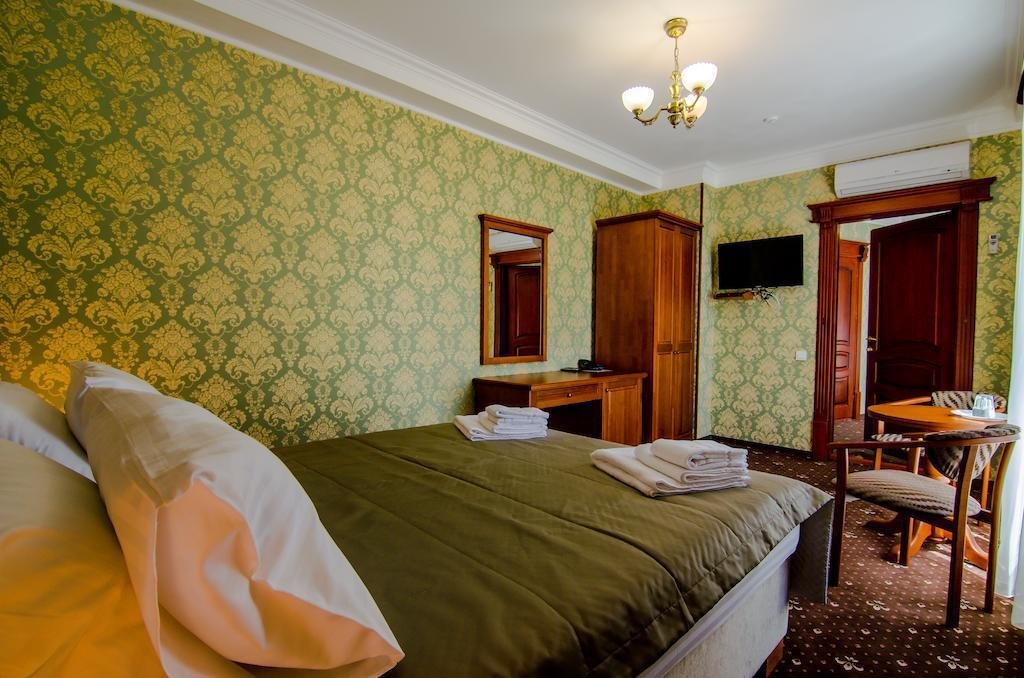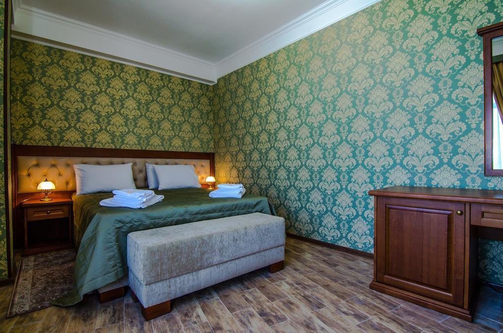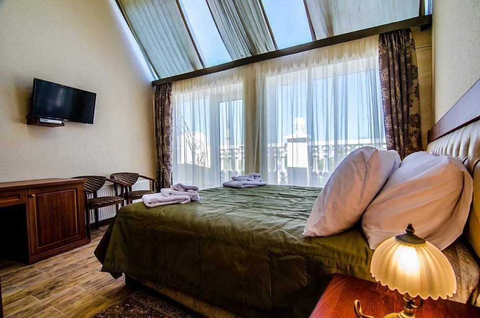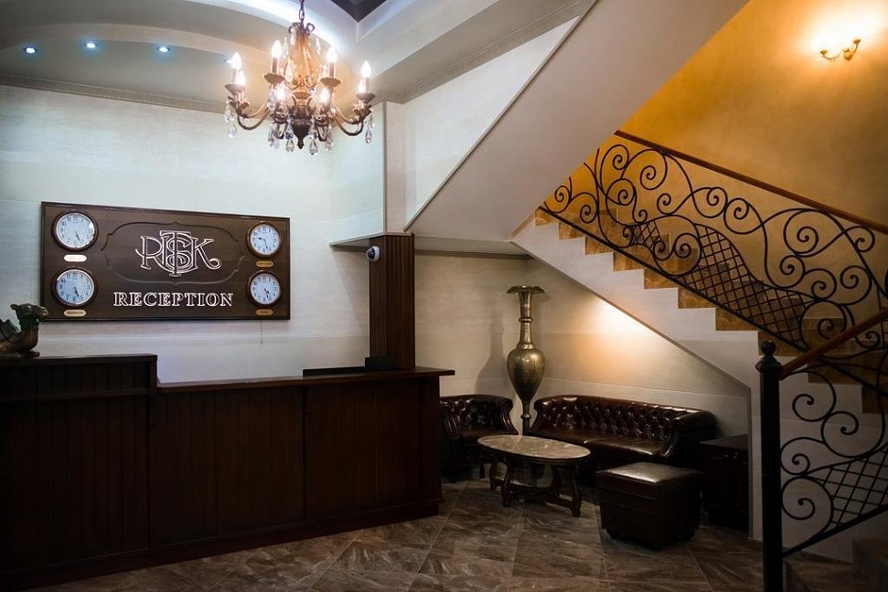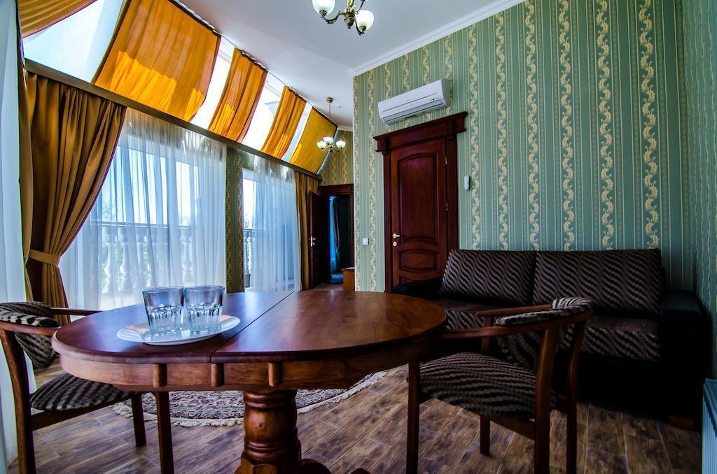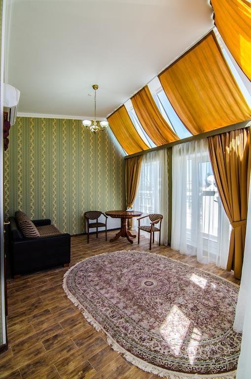 Небольшой, почти семейный, свежеотремонтированный отель, расположенный в здании с богатой историей. Для себя я выделил только два минуса, и то, не принципиальных. Отель находится на окраине Евпатории и в нём нет лифта (в силу исторической особенности постройки и малоэтажности).