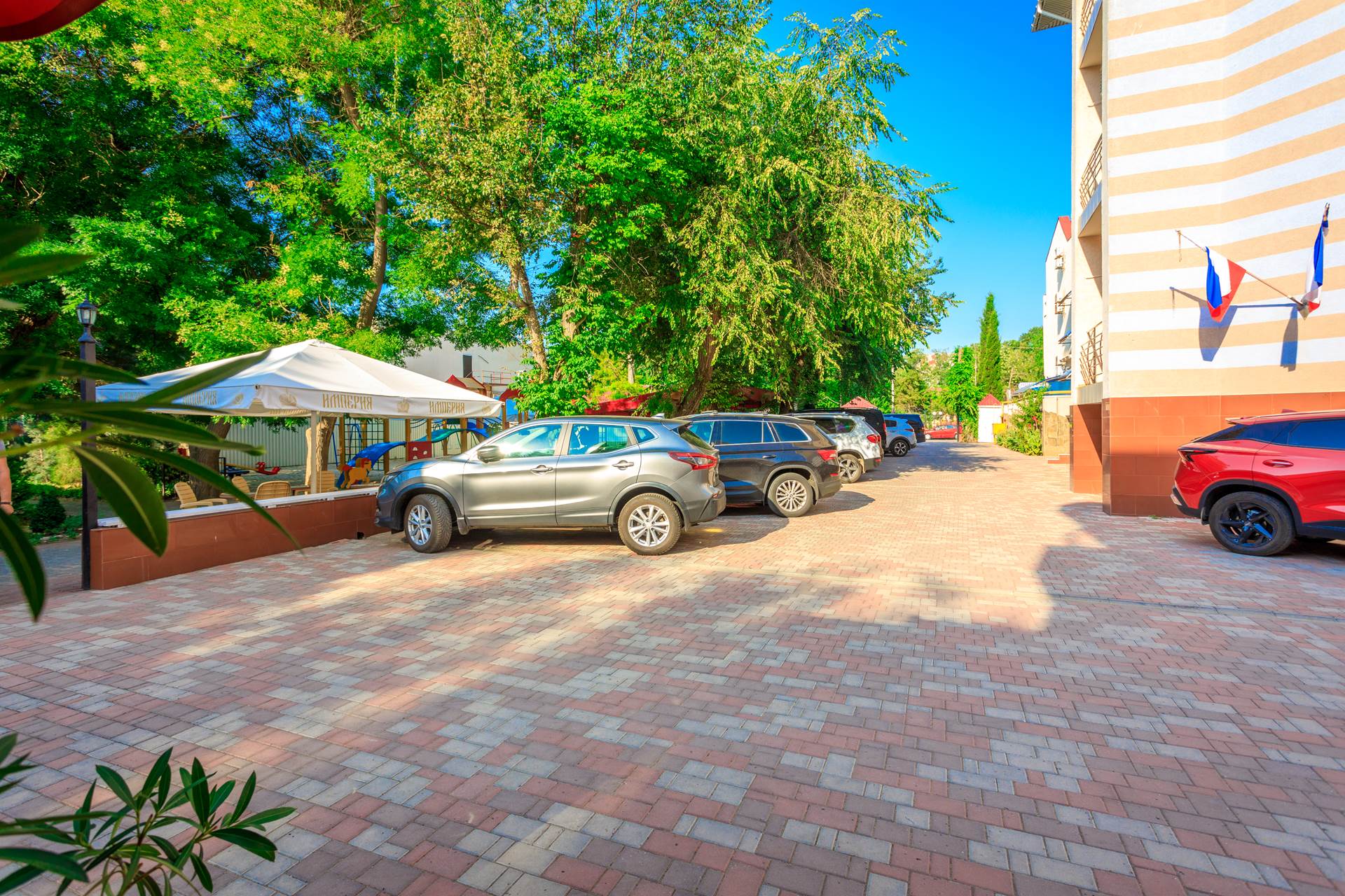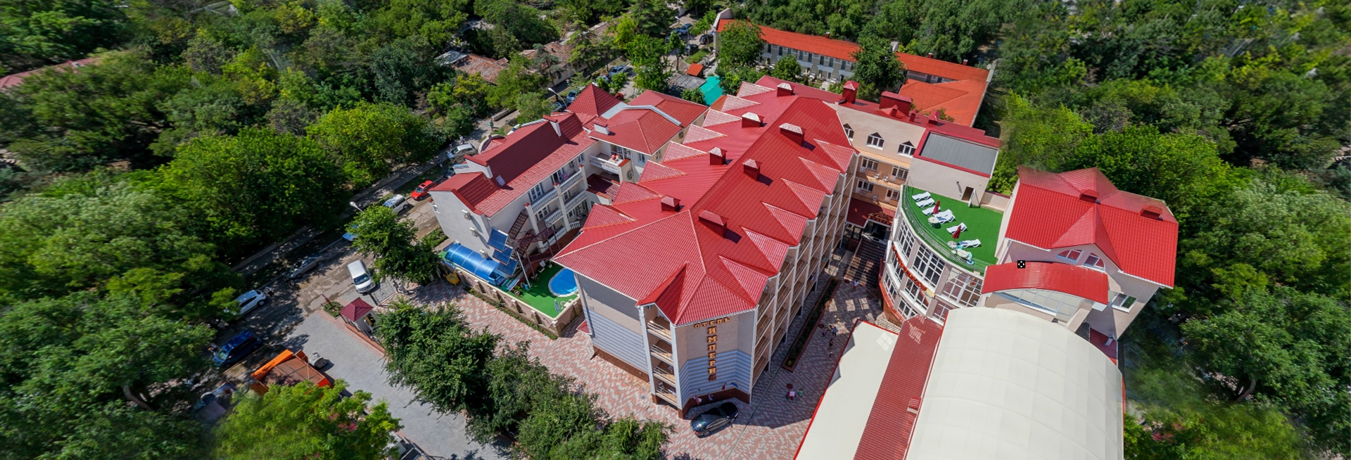 Санаторно-оздоровительный комплекс «ИМПЕРИЯ» – расположен на самом берегу Черного моря в центре города Евпатория, в 30 м от городской набережной им. Горького и в самом сердце курортной жизни города. Рядом с комплексом располагаются: центральный парк, аквариум, дельфинарий.