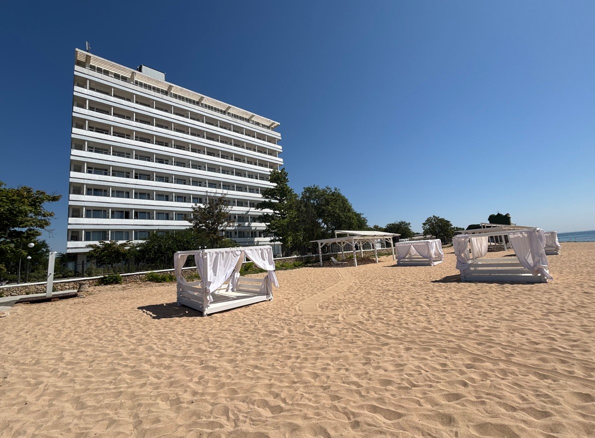 Санаторий расположен на самом берегу моря. Берег моря образует здесь небольшой залив, неглубокий, что делает его безопасным для купания.