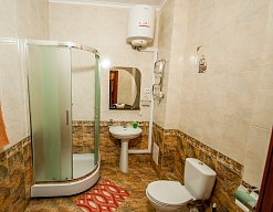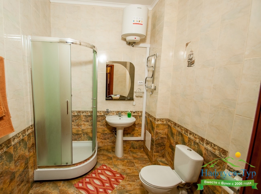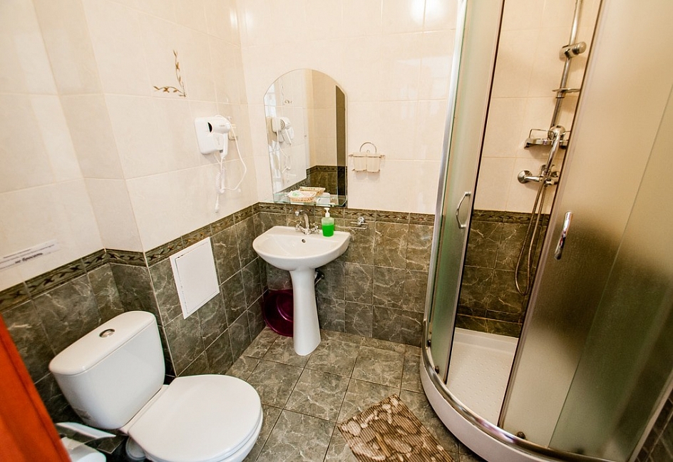 с душевой кабиной, тапочки, туалетные принадлежности, фен