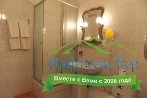 с душевой кабиной, туалетные принадлежности, фен