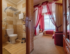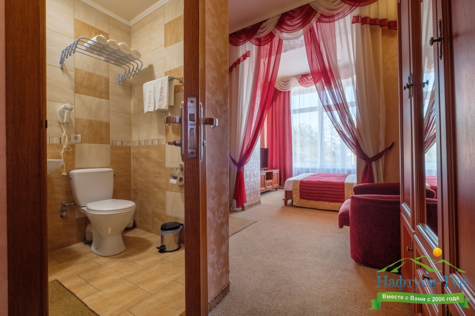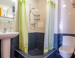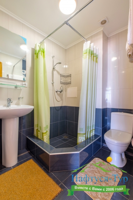с душем (поддон), тапочки, туалетные принадлежности, фен, халат