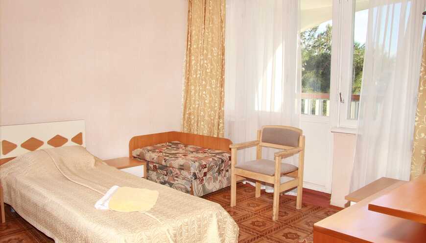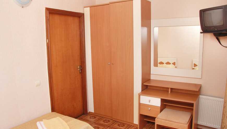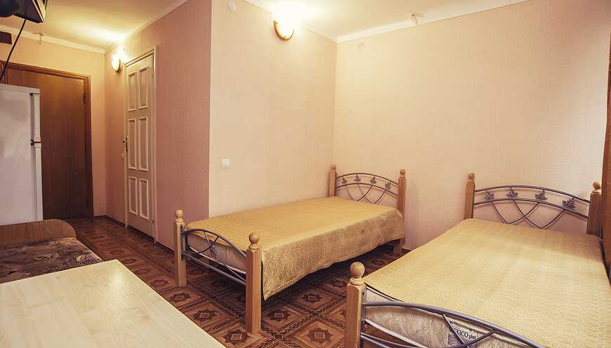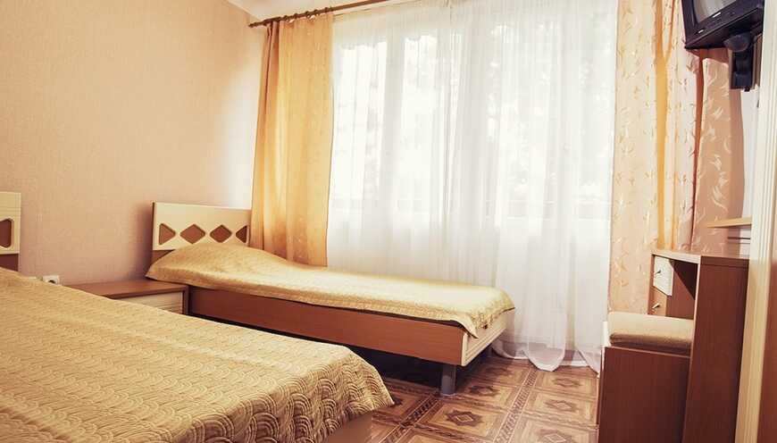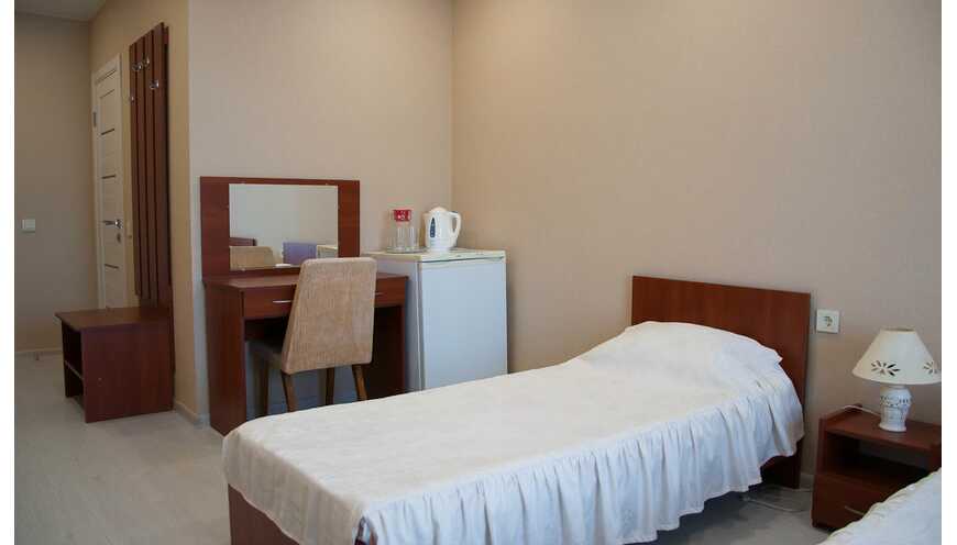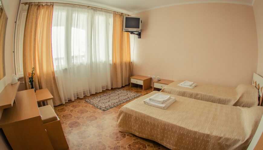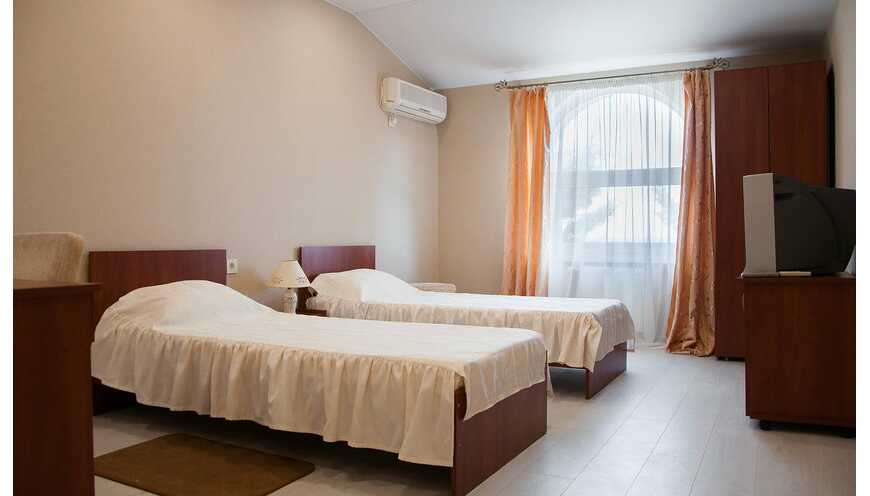 2-местный стандарт (макс. 2+1 чел., 20 кв. м, телевизор, кондиционер, умывальник, фен, халаты, тапочки, холодильник, 1-спальные кровати, душевая кабина, туалет, номера на 1 и 3 этажах). Доп. место - диван-малютка, предоставляется без ограничений по возрасту.