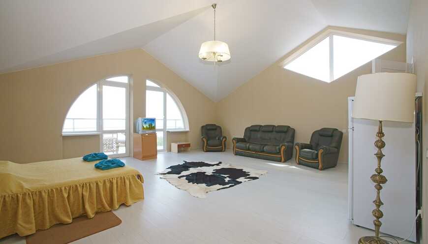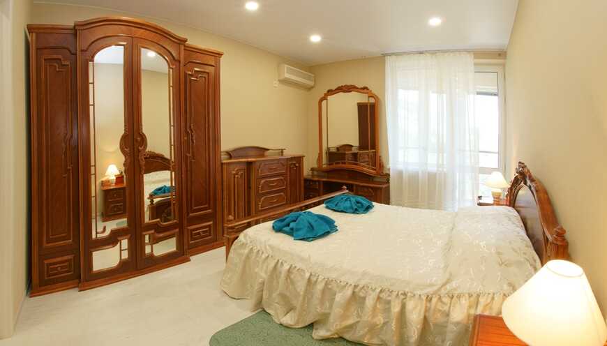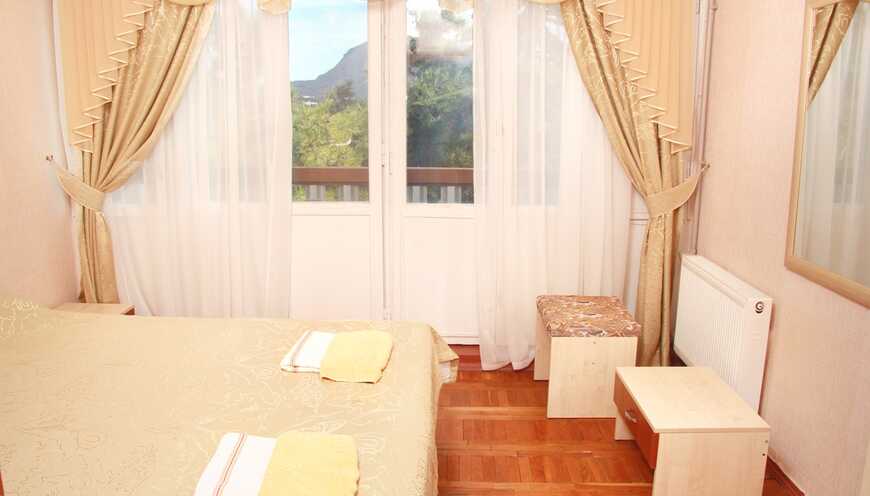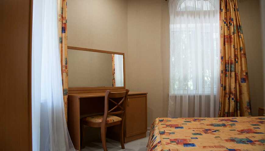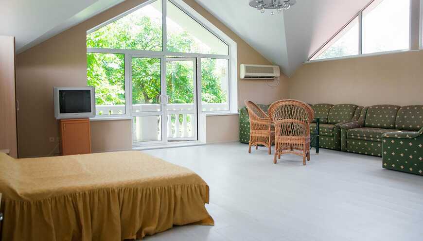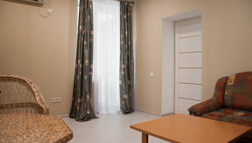 2-местный 2-комнатный улучшенный (макс. 2+2 чел., 36 кв. м, телевизор, кондиционер, умывальник, фен, халаты, тапочки, холодильник, балкон, электрочайник, сейф, 2-спальная кровать, душевая кабина, мини-кухня, набор посуды, туалет, номера на 1-2 этажах). Доп. место - диван, предоставляется без ограничений по возрасту.