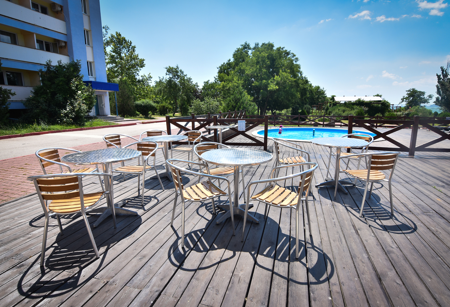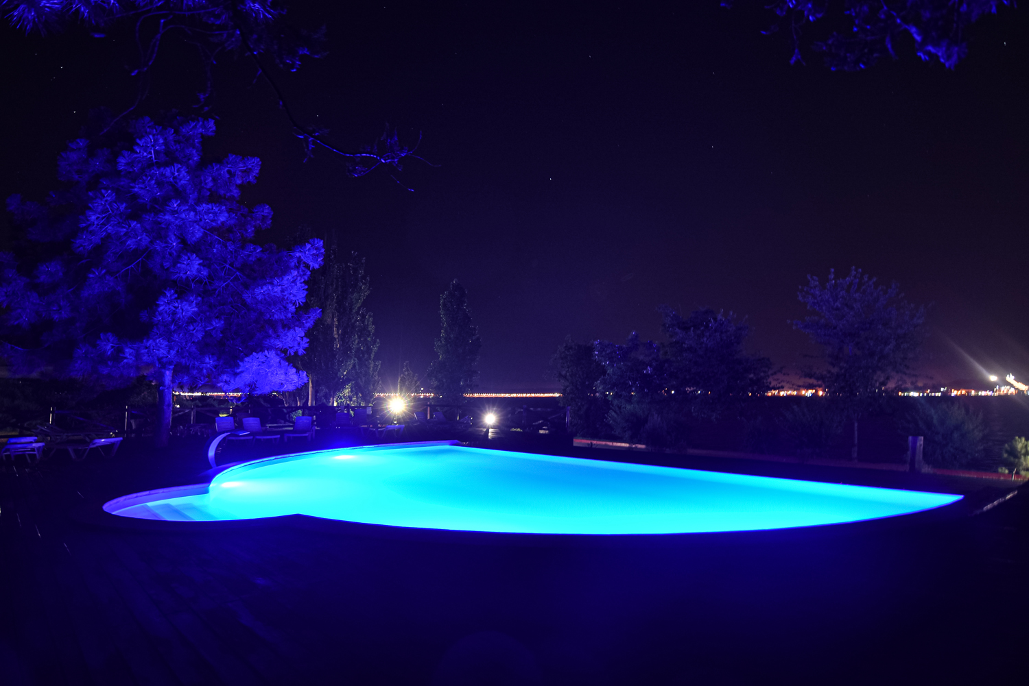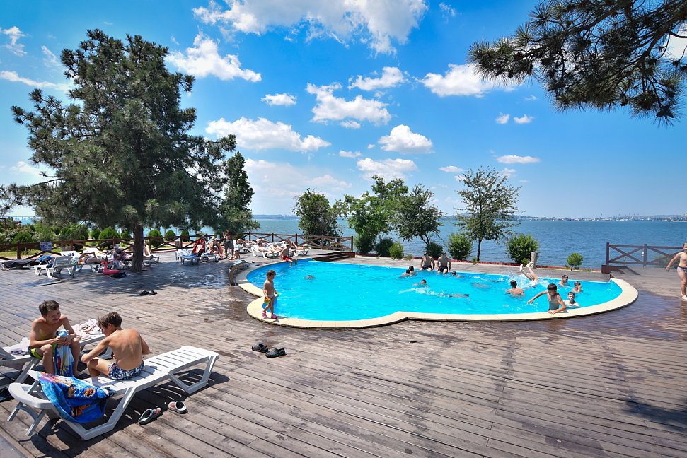 Мы предпочитали отдыхать на гальке или у бассейна. Бассейнов 2, один из них детский, 50 см, пример-но. Странно, что вода в детском бассейне холоднее и в него нет ступенек, даже взрослому неудобно в него спу-ститься, дети в него только прыгают. Взрослый бассейн небольшой, но уютный, вода чистая, за версту хлоркой пахнет). Если в него набежали дети из лагерей, которых одновременно не менее 3-х, то остальные отдыхающие сидят в сторонке - дети прыгают и шумят. Вечером оба бассейна подсвечиваются, красиво.