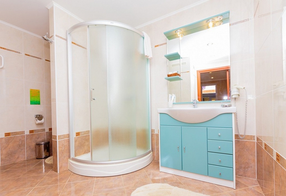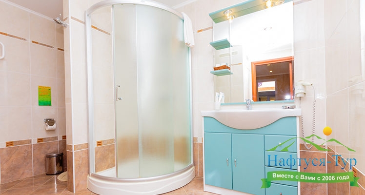 с душевой кабиной, тапочки, туалетные принадлежности, фен
