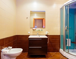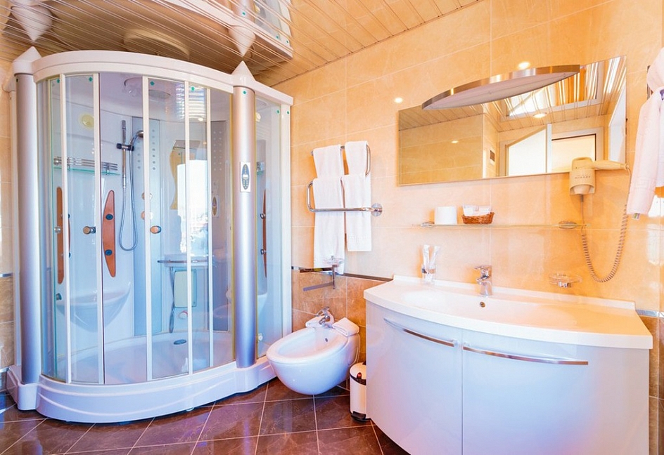 биде, с душевой кабиной, тапочки, туалетные принадлежности, фен