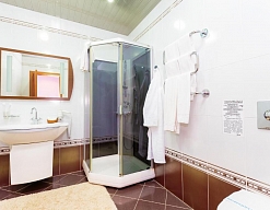 с душевой кабиной, тапочки, туалетные принадлежности, фен, халат