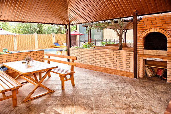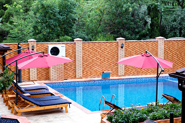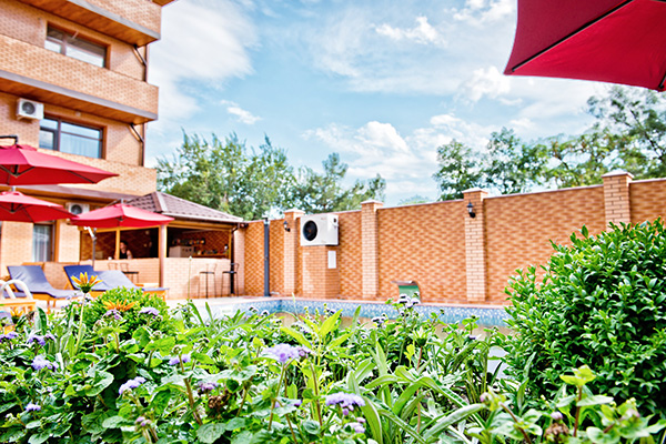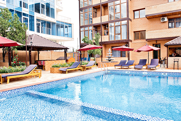 На территории отеля Вас ждет большой бассейн с подогревом в холодное время года (открыт с 1 мая по 30 сентября) и детским отделением, две большие террасы с каменными мангалами и принадлежностями для барбекю, бар, шезлонги у бассейна и детская площадка.