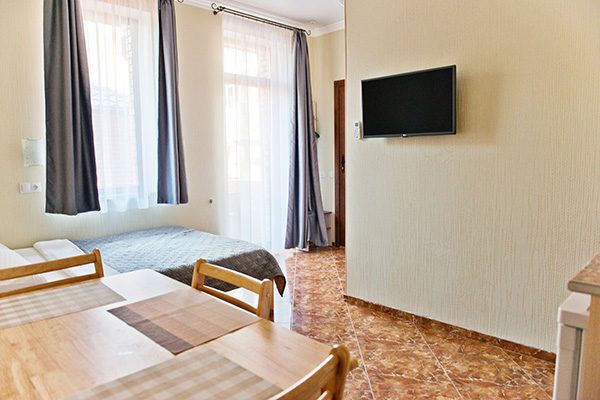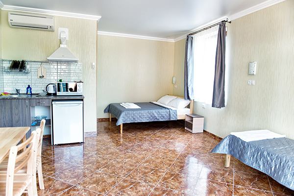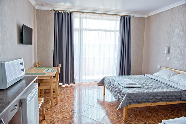 Каждый номер оборудован всем необходимым, чтобы Вы почувствовали себя в нашем отеле, как дома. Помимо стандартных для нас кондиционеров, TV с плоским экраном, WiFi и прочего, во всех номерах есть мини-кухня с микроволновой печью и обеденная зона.