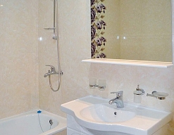 с ванной, тапочки, туалетные принадлежности, фен, халат