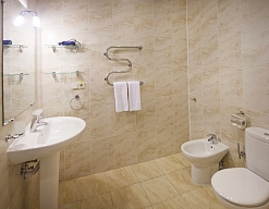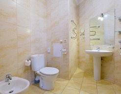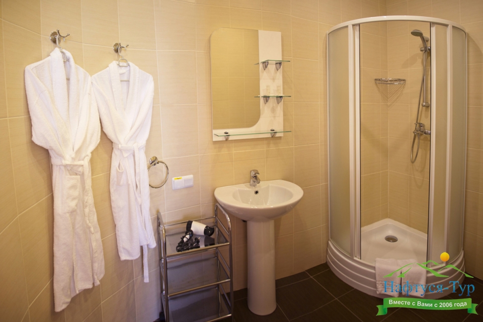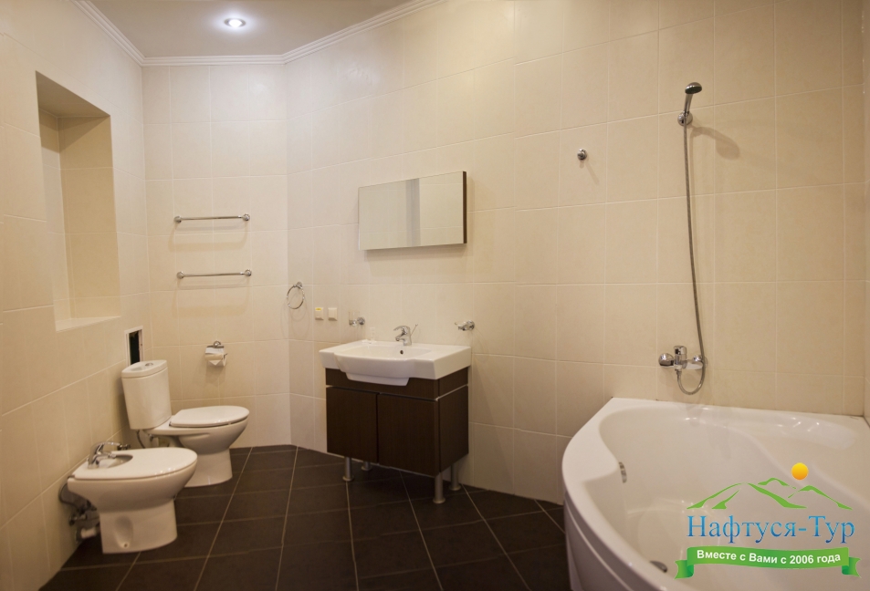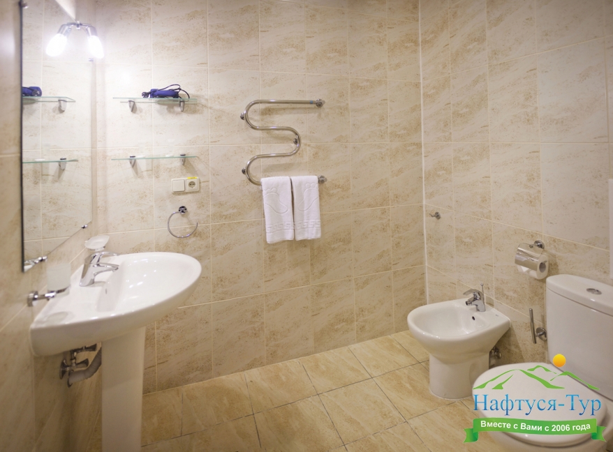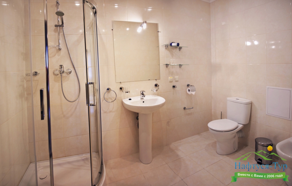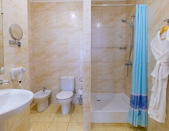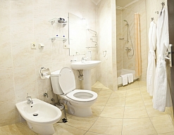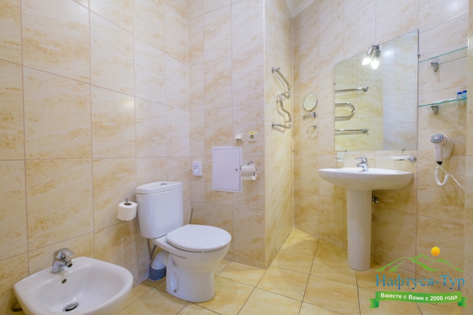 2 санузла, биде, с ванной, с душевой кабиной, тапочки, туалетные принадлежности, фен, халат