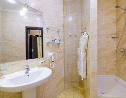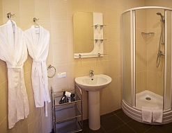 с душем (поддон), тапочки, туалетные принадлежности, фен, халат