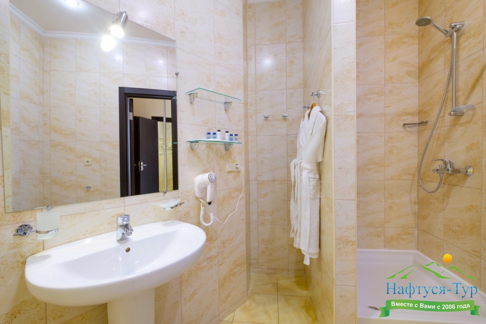 с душем, тапочки, туалетные принадлежности, фен, халат