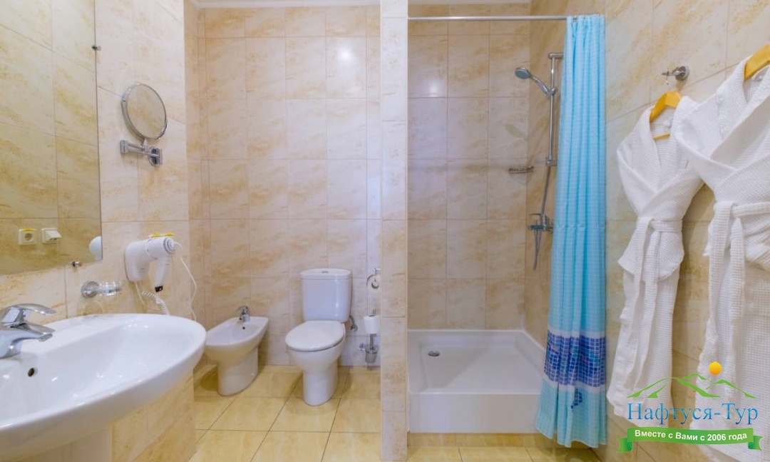 биде, с душем, тапочки, туалетные принадлежности, фен, халат