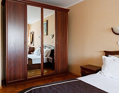 вешалка, диван, зеркало, кровать двуспальная, прикроватные тумбочки, стол, столик журнальный, стул, шкаф