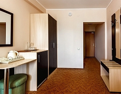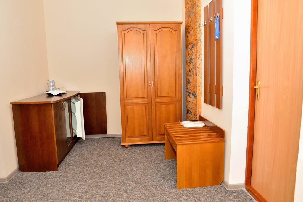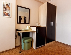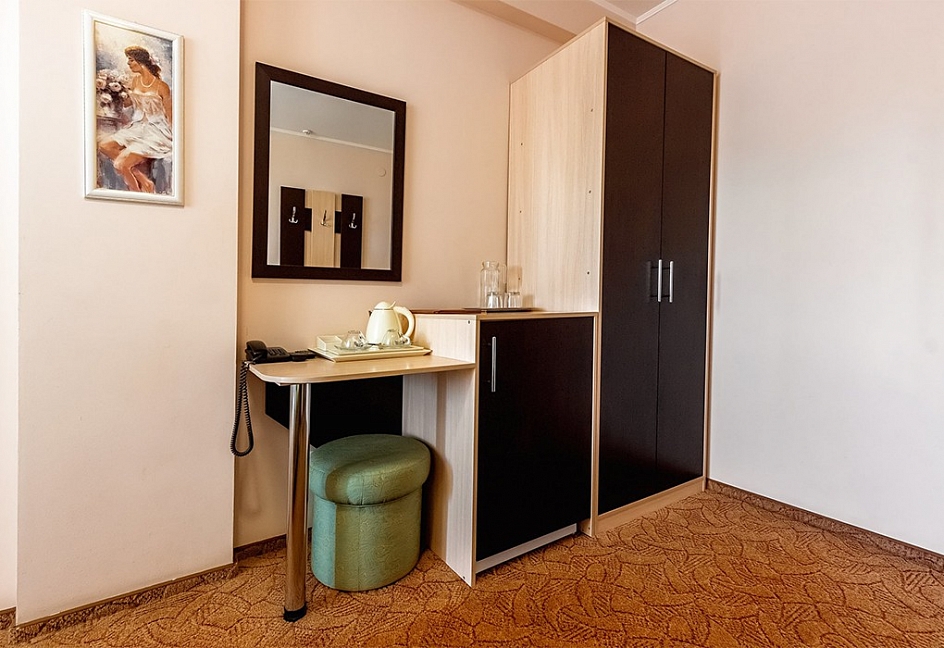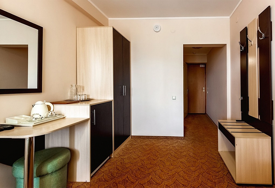 вешалка, зеркало, кровать двуспальная/ две полутороспальные кровати, прикроватные тумбочки, стол, стул, шкаф