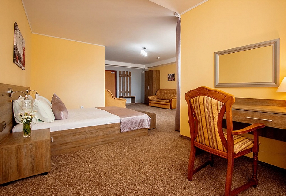 вешалка, диван, зеркало, кровати полутороспальные, кровать двуспальная, прикроватные тумбочки, стол, стулья, шкаф