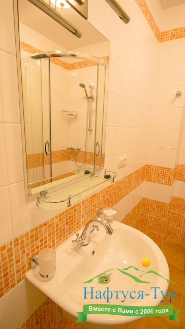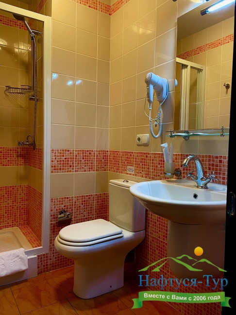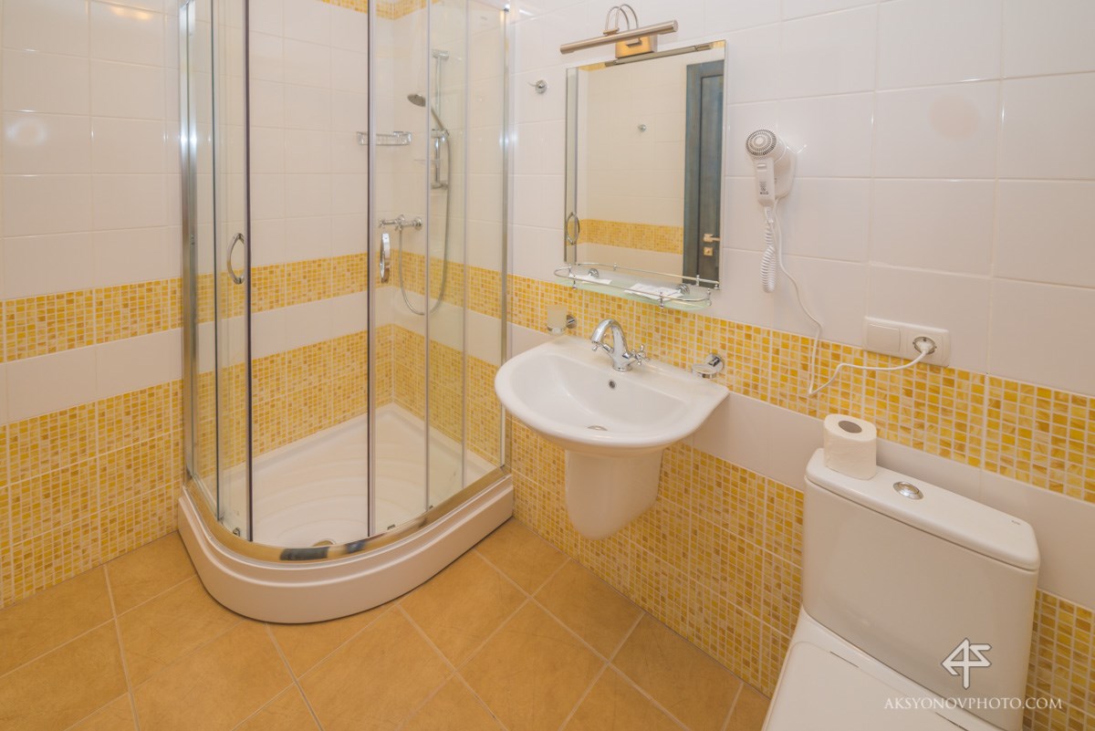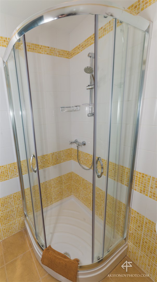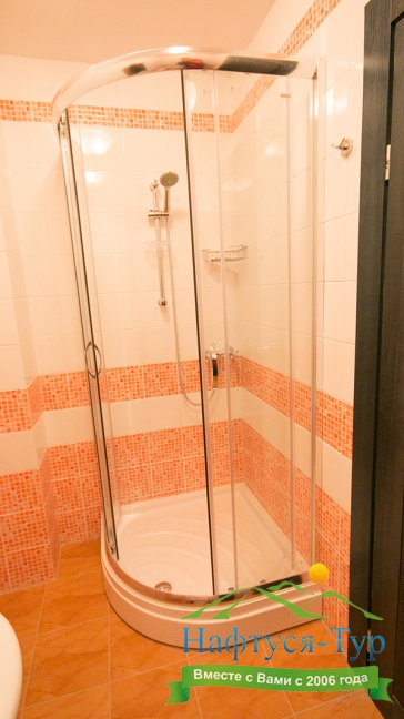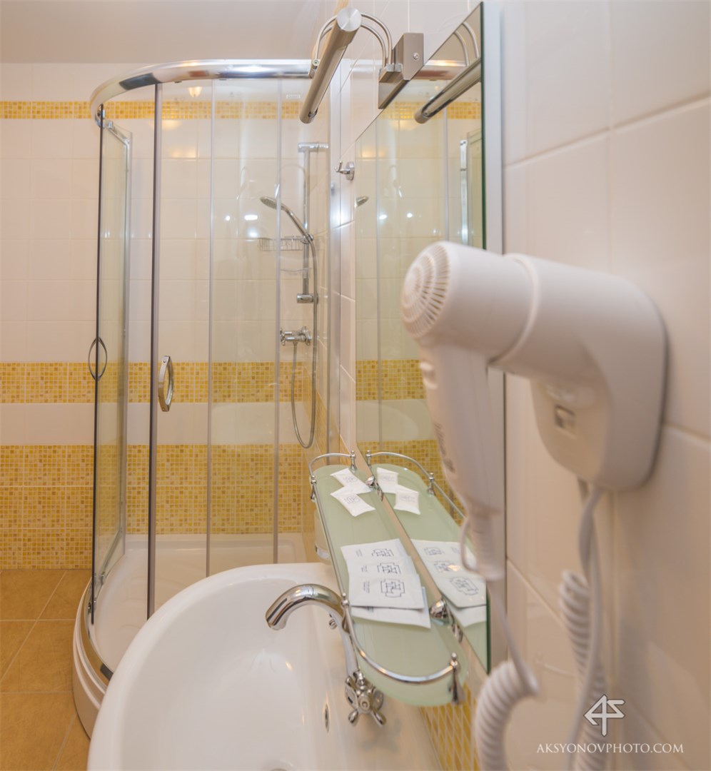 с душевой кабиной, тапочки, туалетные принадлежности, фен, халат