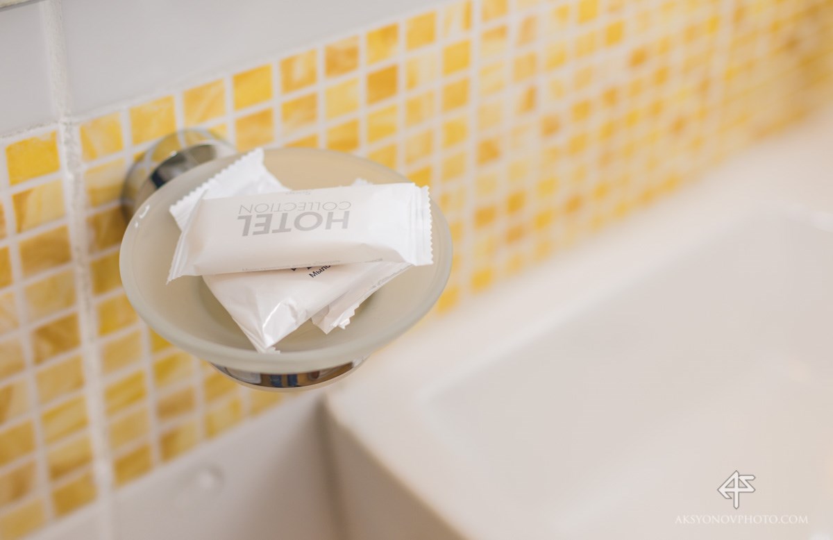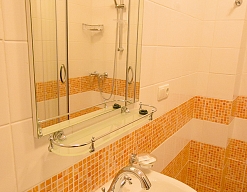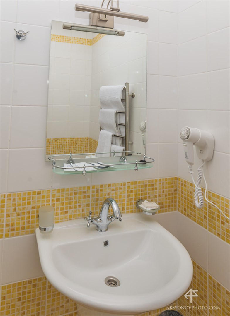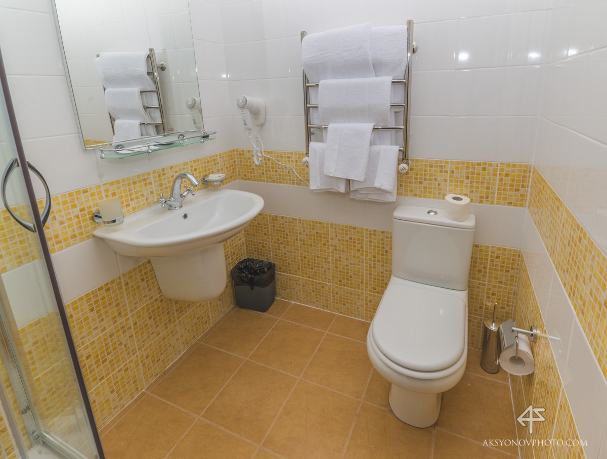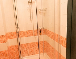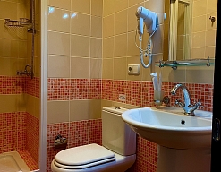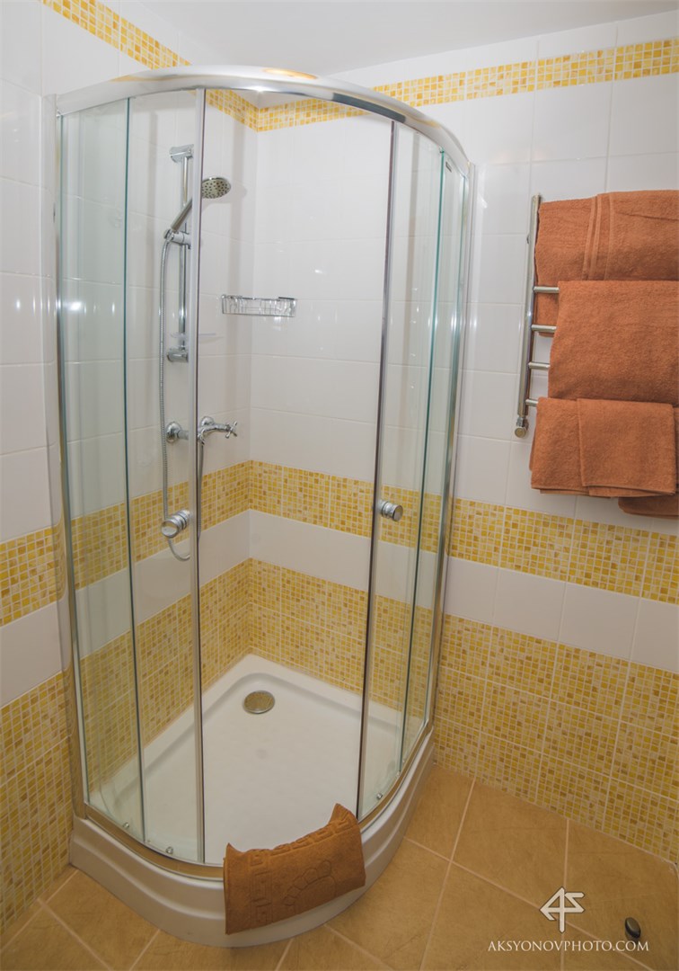 с душевой кабиной, тапочки, туалетные принадлежности, фен, халат
