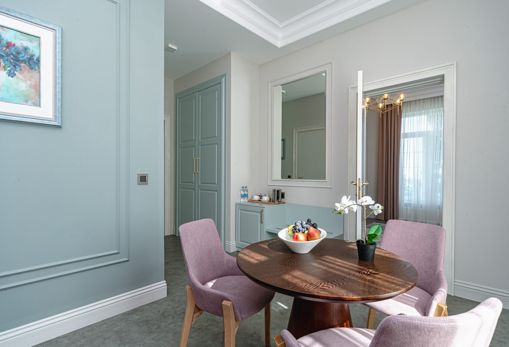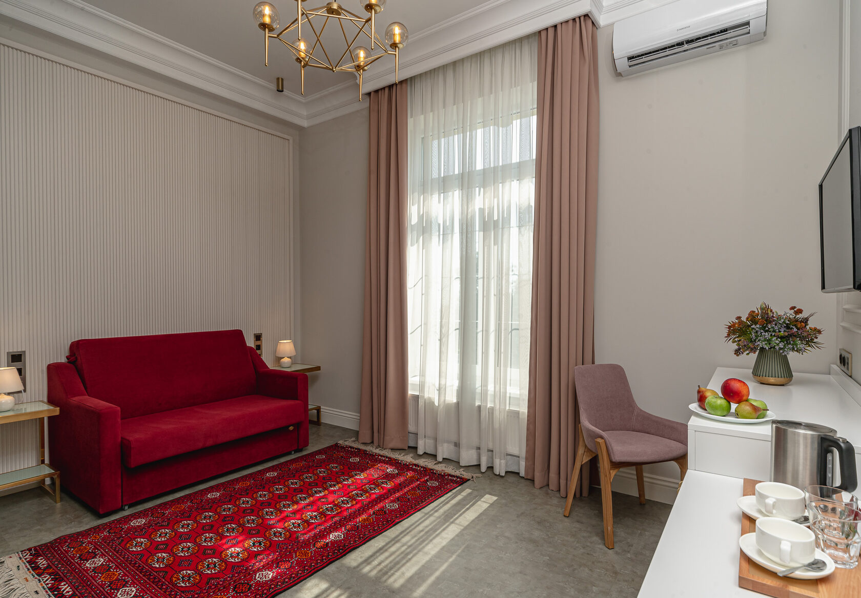 В номерах есть чайник, а в некоторых — балкон. В номерах обустроена гостиная зона.