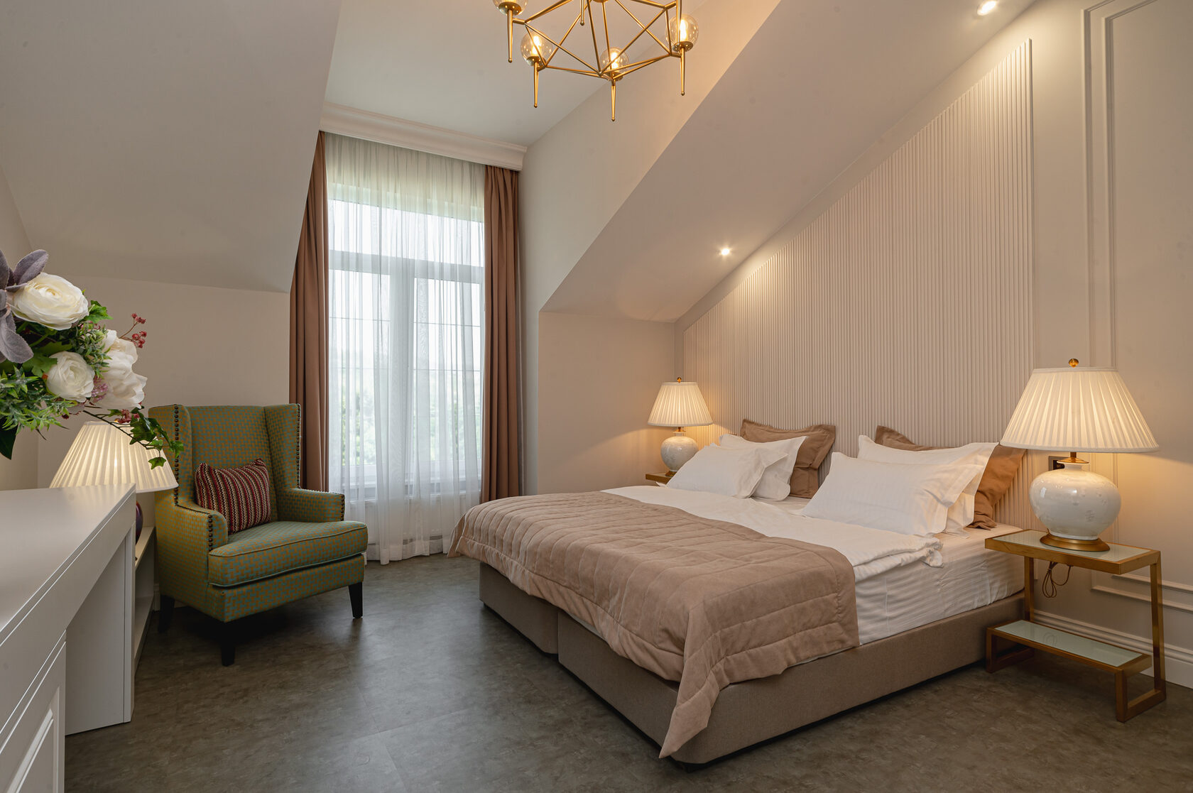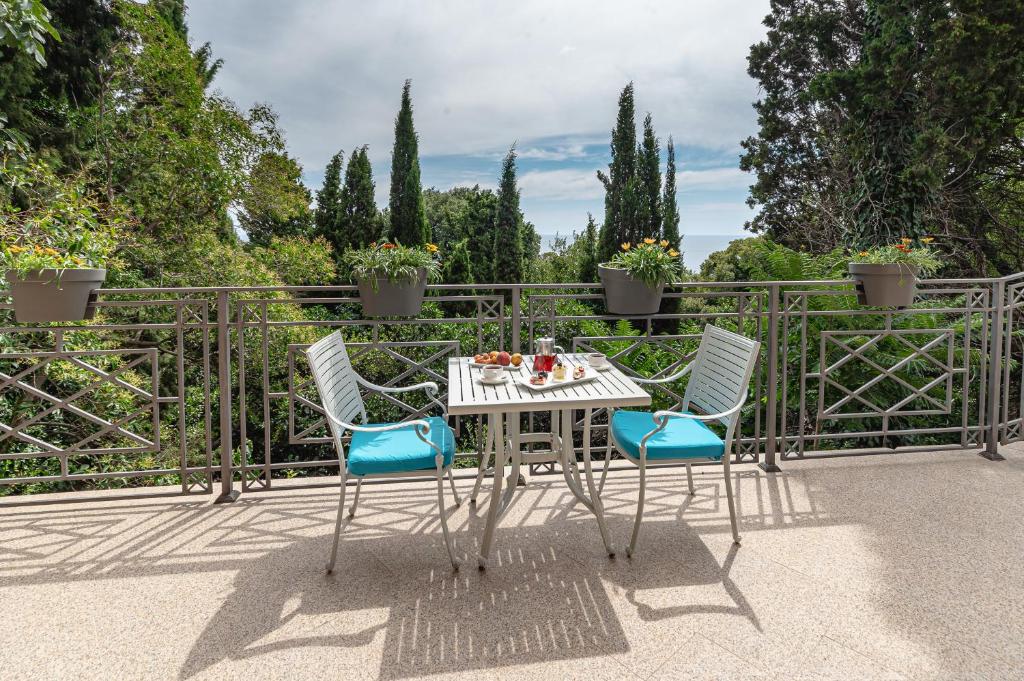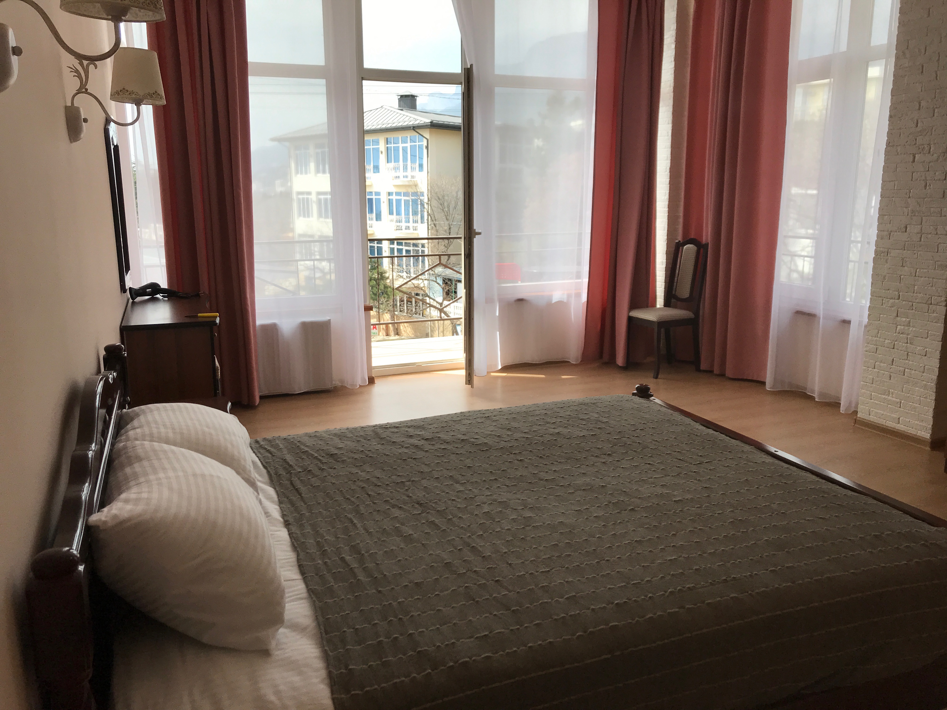 Все номера виллы "Княжий град" имеют эко-отделку из дерева и балкон с видом на Черное море и горные леса. В ванных комнатах есть тапочки и халаты.