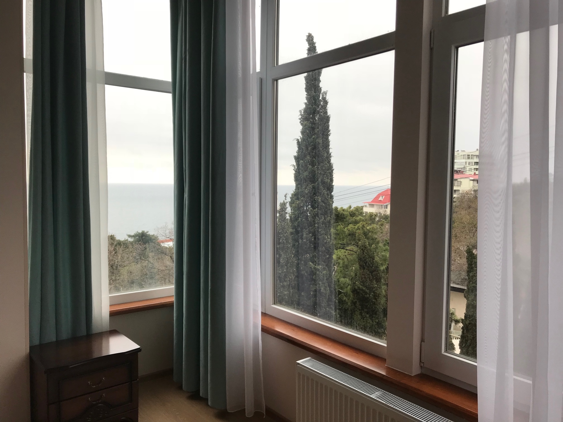 В окна, выходящие на южную сторону, видны Аю-Даг (Медведь-гора) и скалы-близнецы Адалары, северную сторону, можно видеть участок грандиозного скального амфитеатра над Гурзуфом.