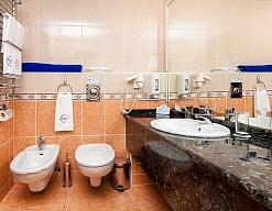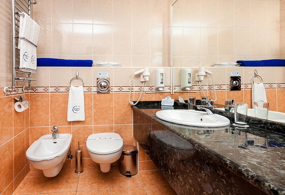 биде, с ванной, тапочки, туалетные принадлежности, фен, халат