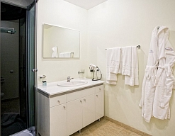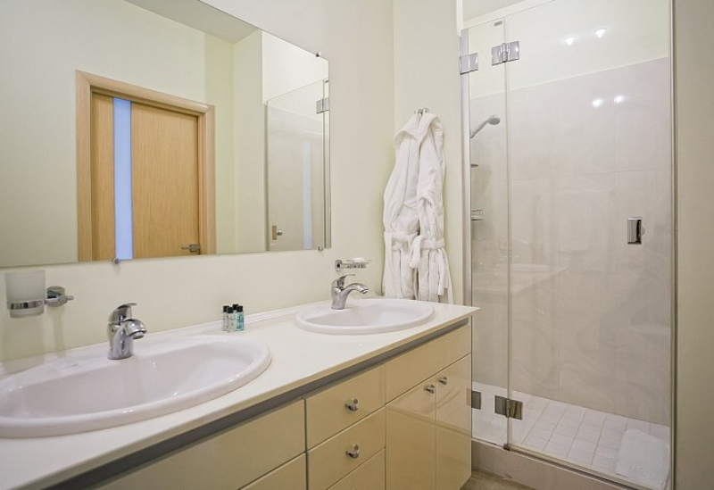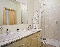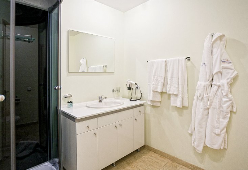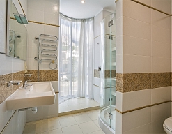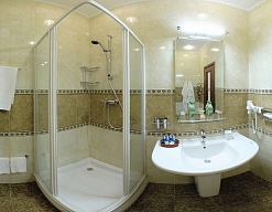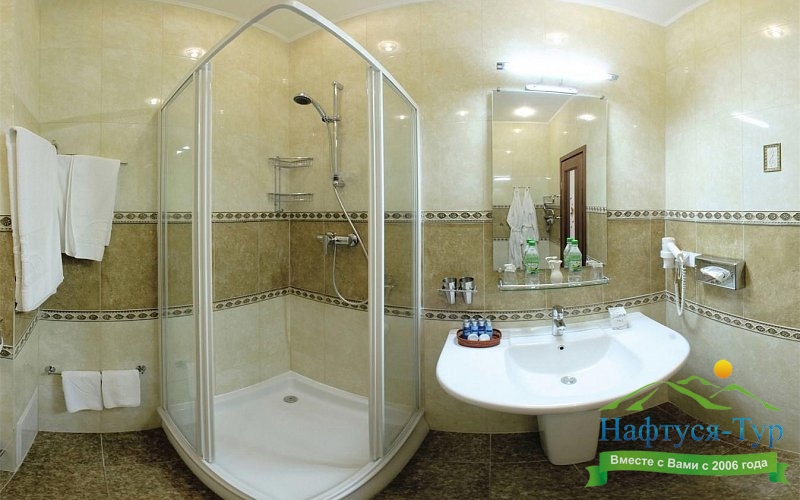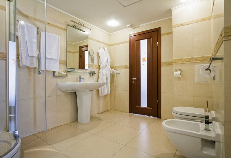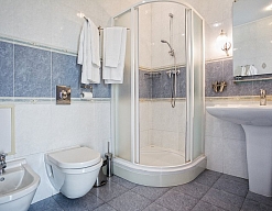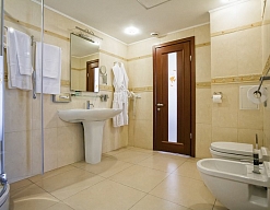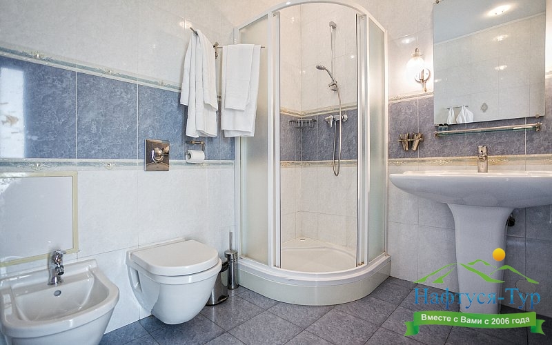 биде, с душевой кабиной, тапочки, туалетные принадлежности, фен, халат