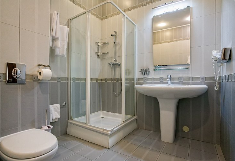 биде, с душевой кабиной, тапочки, туалетные принадлежности, фен