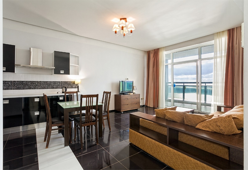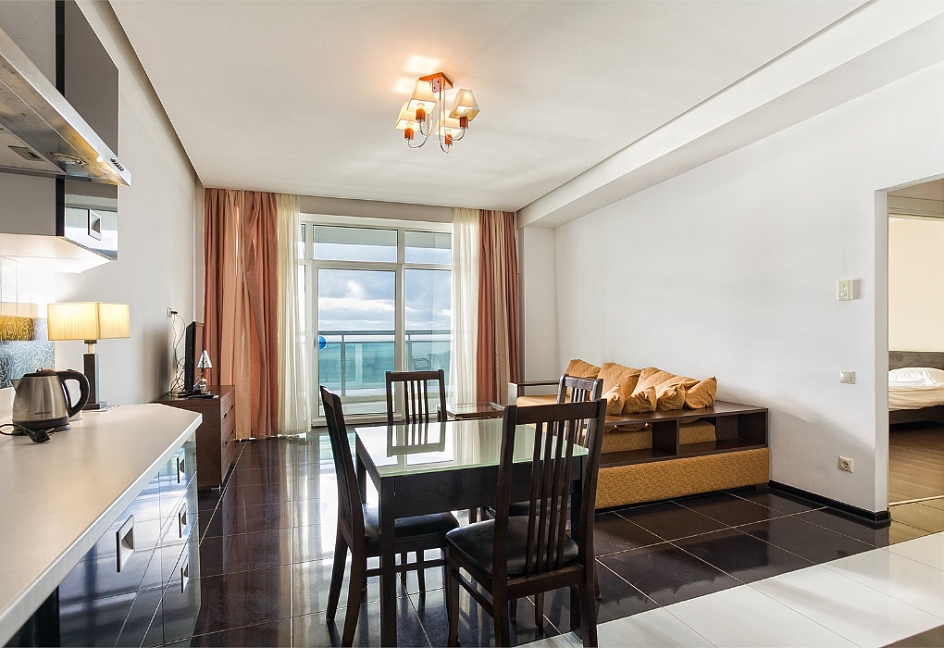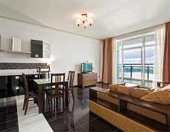 В стоимость номера входят завтраки и посещение СПА комплекса. Банный комплекс(СПА) шикарный с 9 видами бань, на любой вкус с различной температурой. Доброжелательный персонал, номера с террасами, почти размером с номер, уборка до уровня стерильности, тёплый пол в ванной, белоснежная постель. Сам отель находится на горе, но к Набережной ведёт канатная дорога. Ресторан на территории "дорогой", но довольно вкусная еда. Моё мнение такое, что "Respect Hall"хорош для посещения в не пляжный сезон. Имеются закрытый и открытий бассейны. Красиво расположен гриль-бар у бассейна на улице. Классный дизайн у караоке бара.Маленькая рекомендация-если вы вдвоем можно поселится в номер,если же с детьми,тогда в апартаменты. Короче говоря-классное местечко.