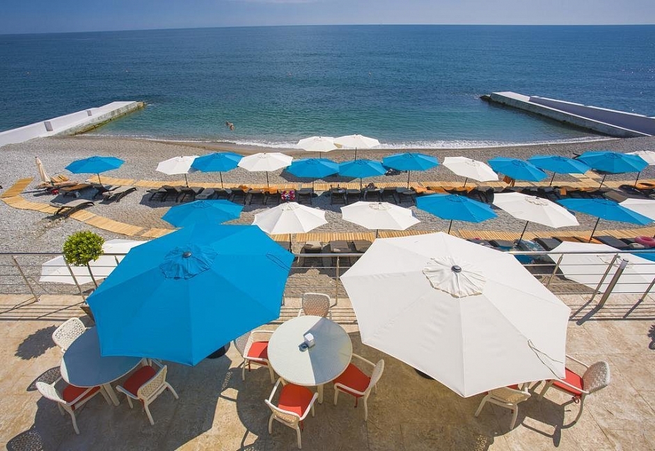 Собственный пляж, мелко-галечный, благоустроенный в 300 м от корпуса. Спуск на пляж на эскалаторе.