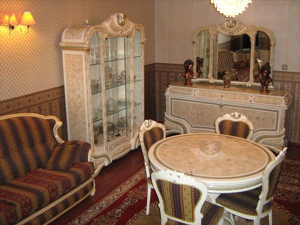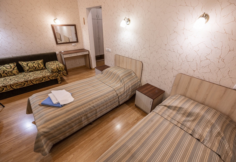 вешалка, диван, зеркало, кровати односпальные /одна двуспальная кровать, прикроватные тумбочки, стол, стулья, шкаф