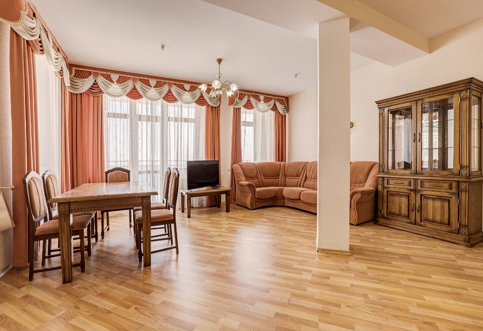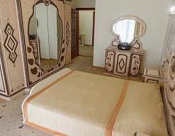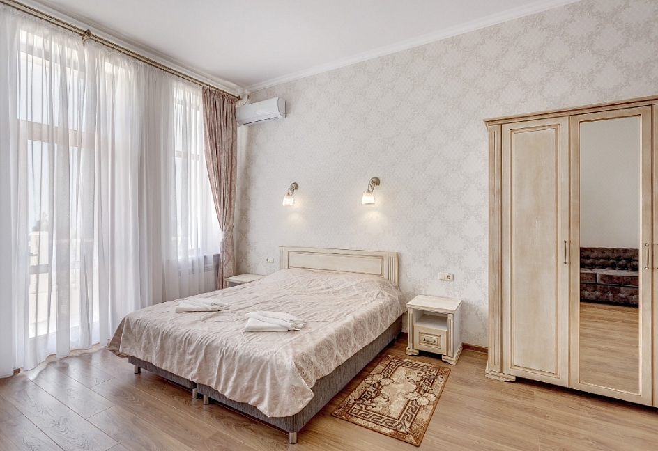 вешалка, диван, зеркало, кровать двуспальная, прикроватные тумбочки, стол, стулья, шкаф