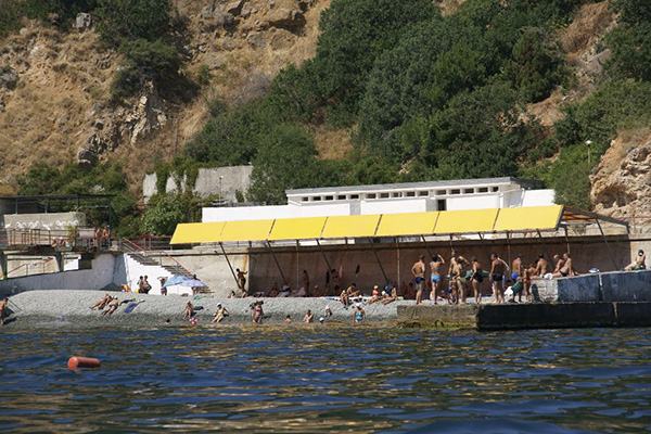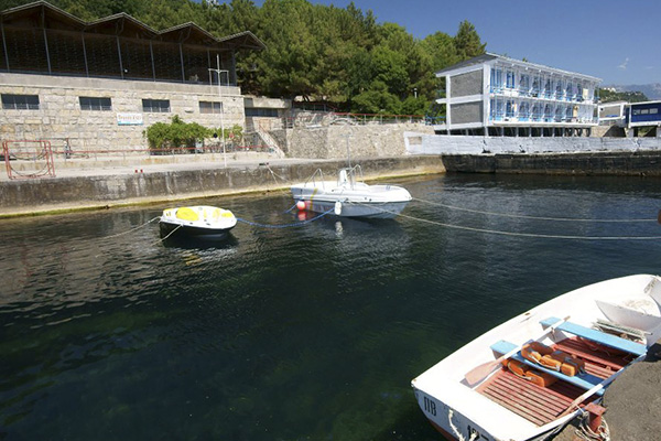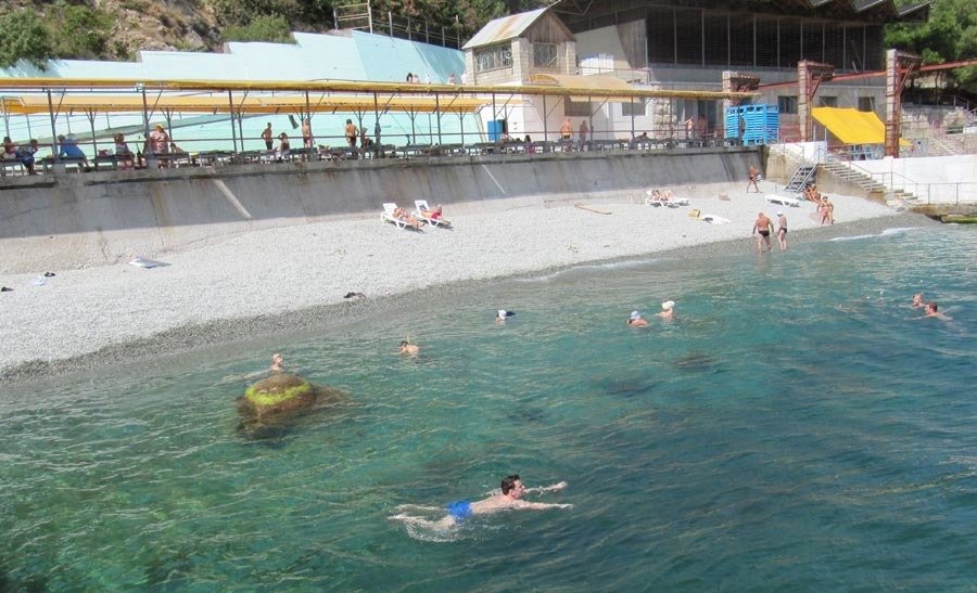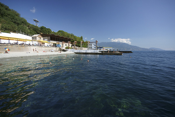 собственный, галечный (спуск по канатной дороге). Оборудован теневыми навесами, открытым солярием. На пляже имеется лодочная станция, бары. Расстояние до пляжа - 500 м.