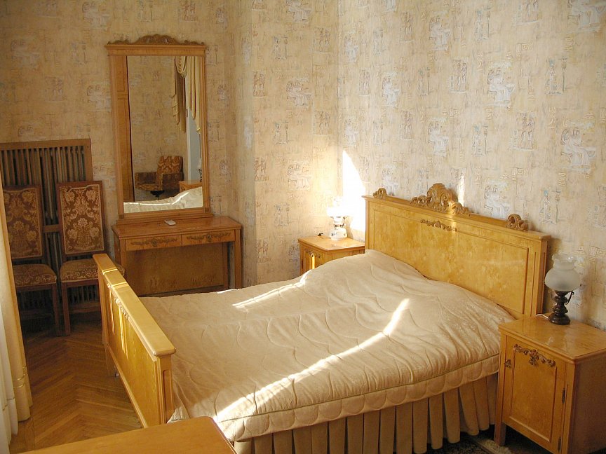 вешалка, диван, зеркало, кровать двуспальная, прикроватные тумбочки, столик туалетный, шкаф