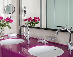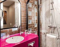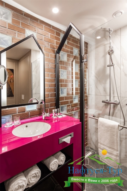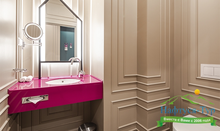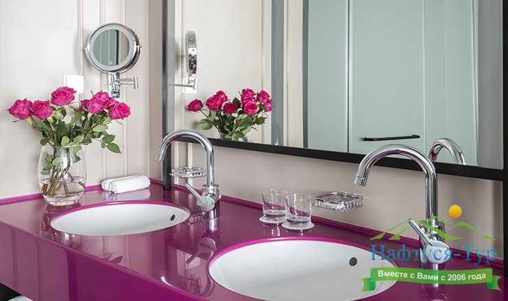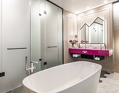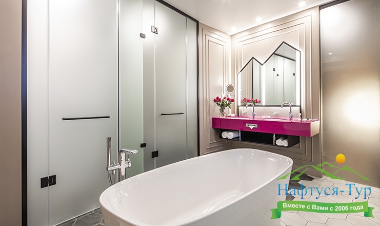 с ванной, с душем, тапочки, туалетные принадлежности, фен, халат