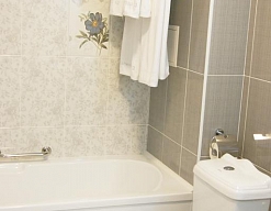 с ванной, тапочки, туалетные принадлежности, фен, халат