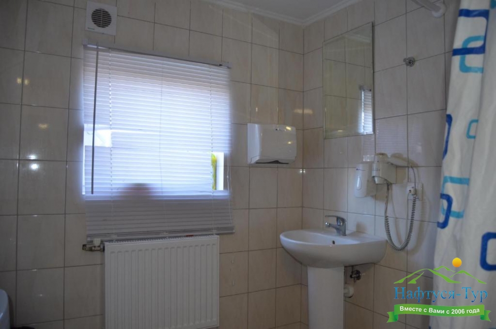 с душем, тапочки, туалетные принадлежности, фен