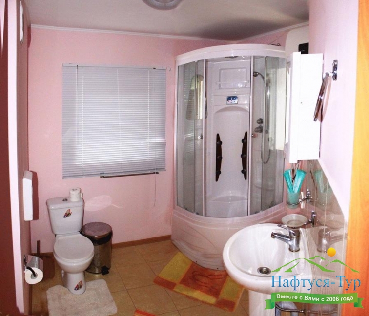 с душевой кабиной, тапочки, туалетные принадлежности, фен, халат