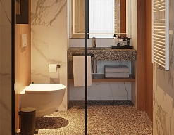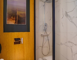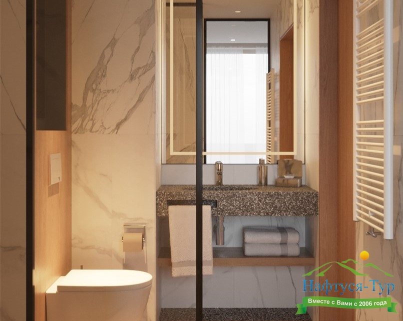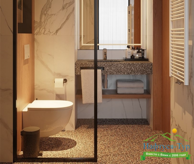 с душем, тапочки, туалетные принадлежности, фен, халат