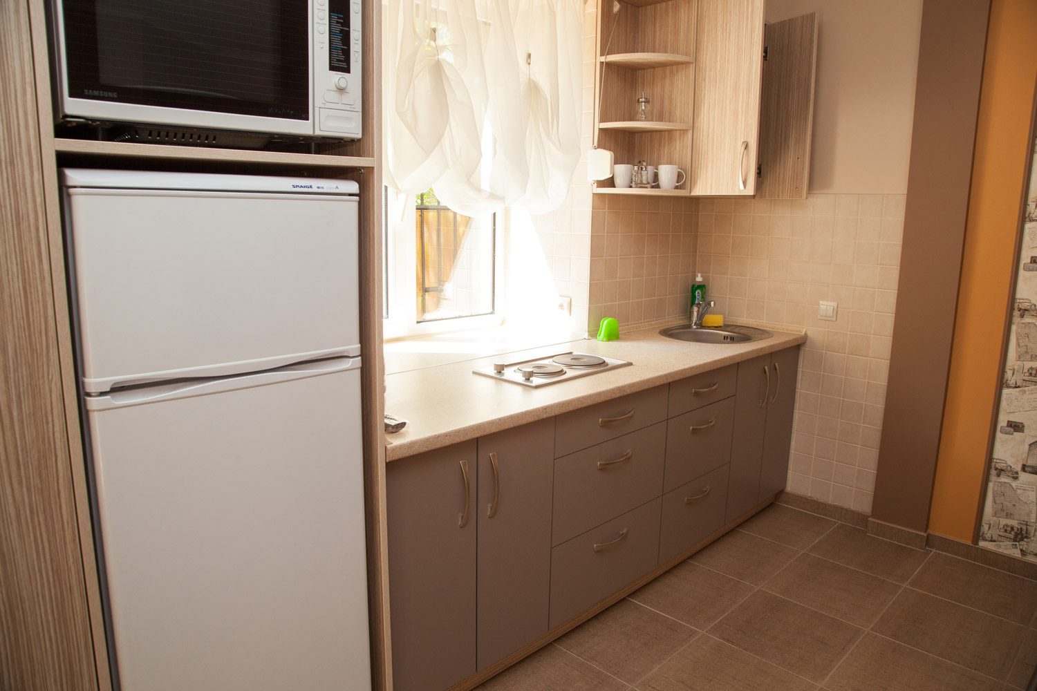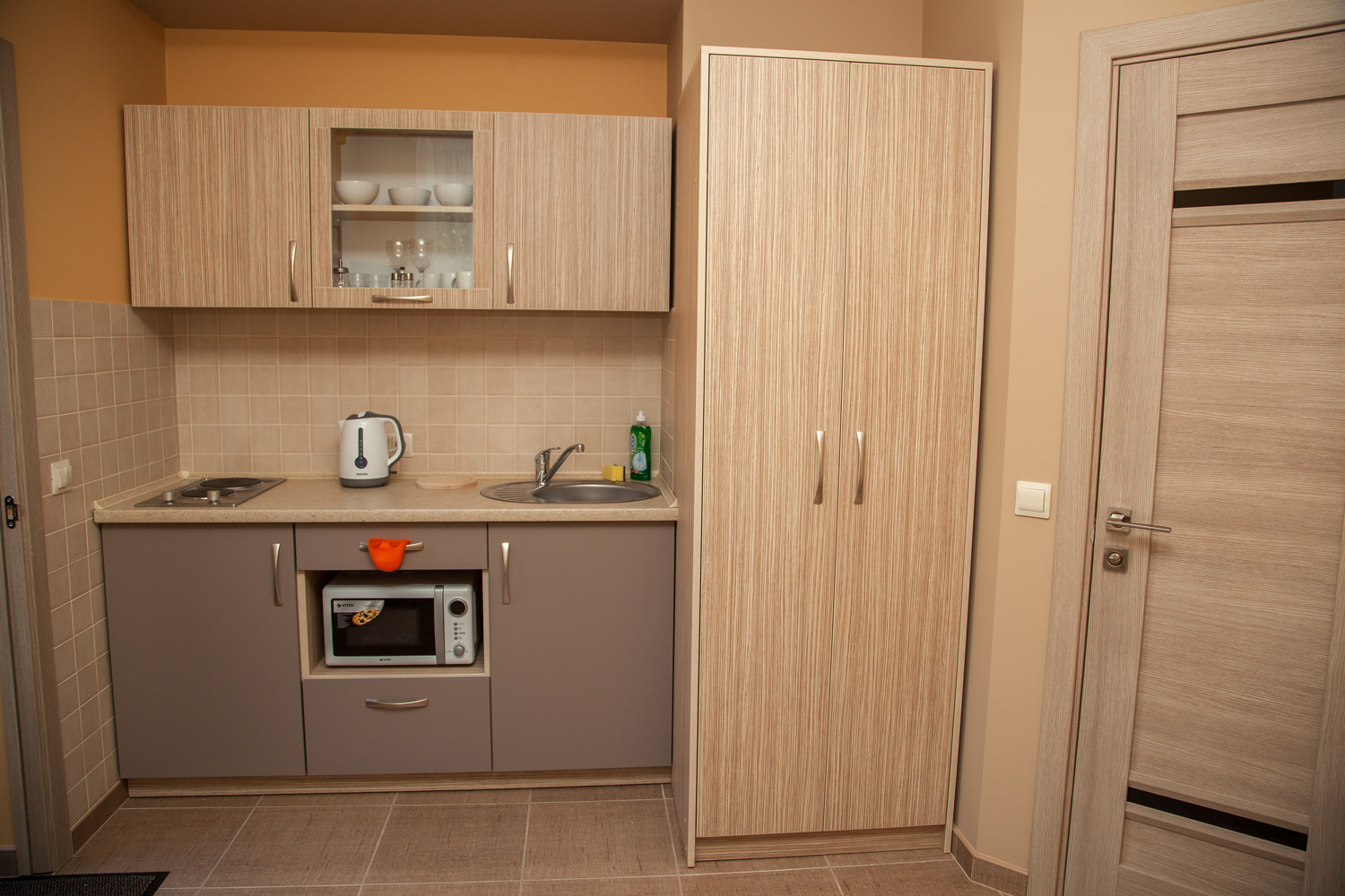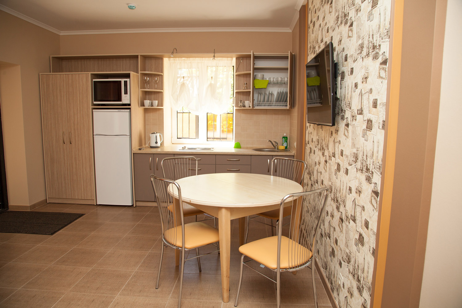 микроволновая печь, телевизор, холодильник, чайный набор посуды, электрочайник