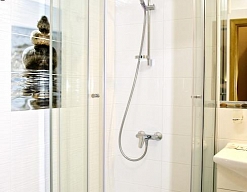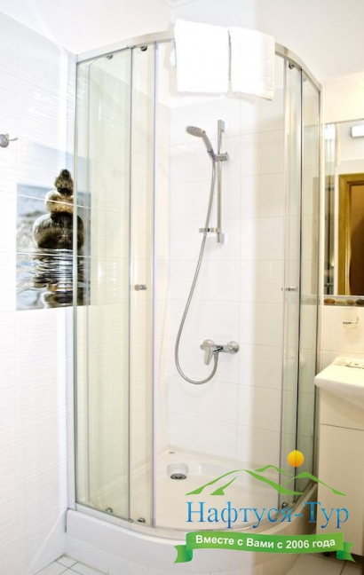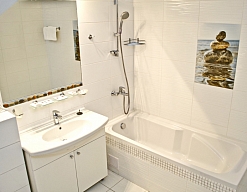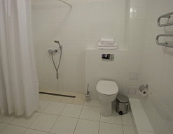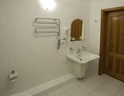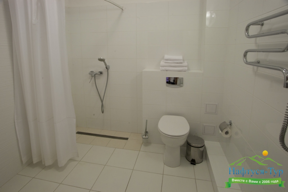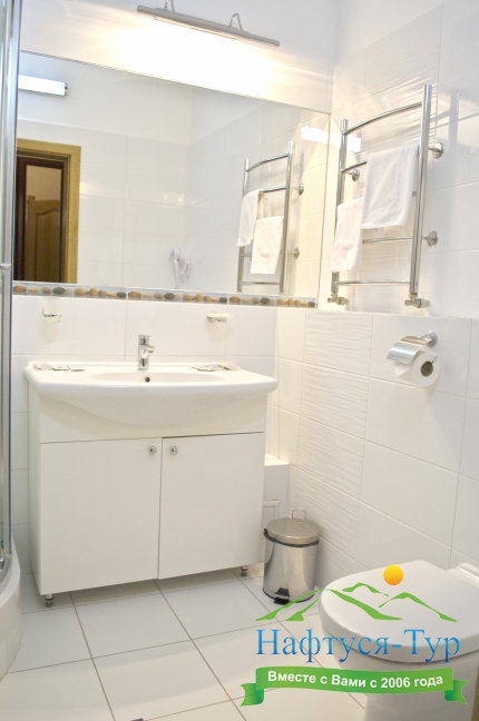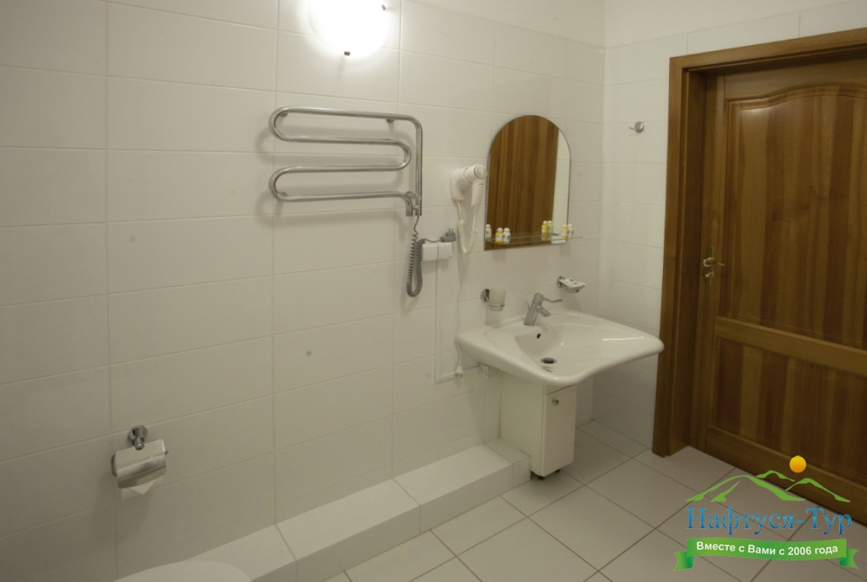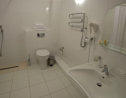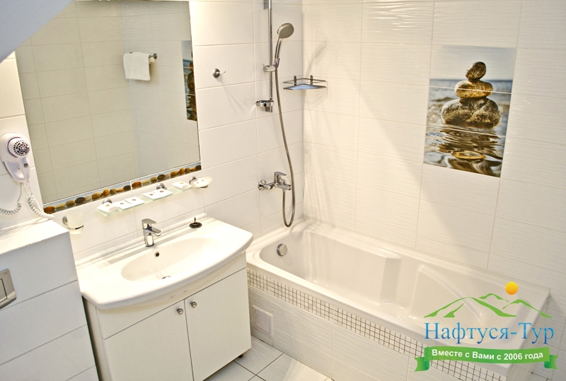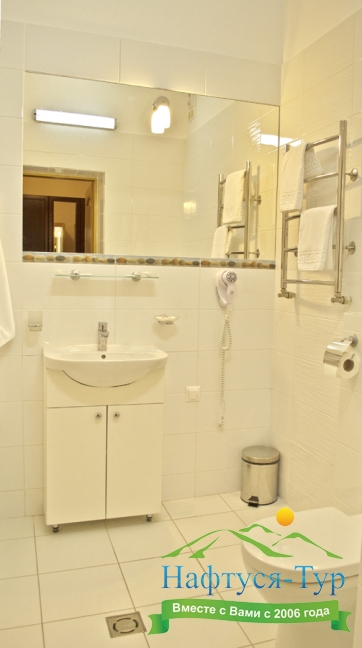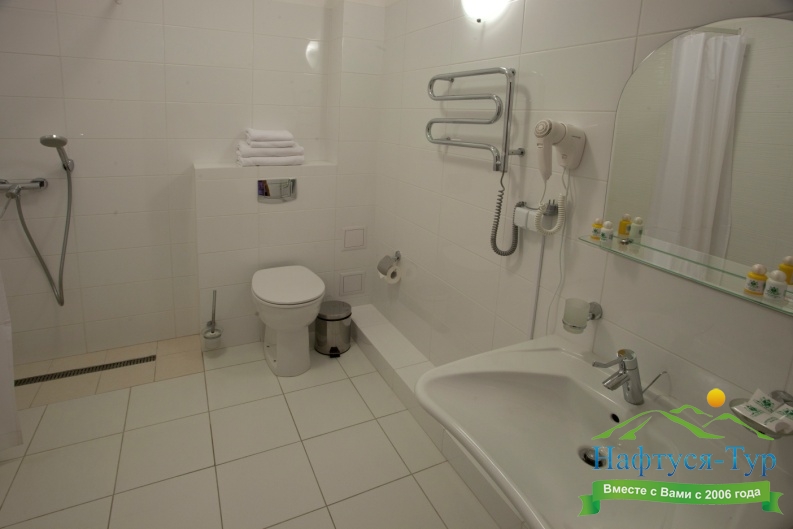 с ванной или душевой кабиной, тапочки, туалетные принадлежности, фен
