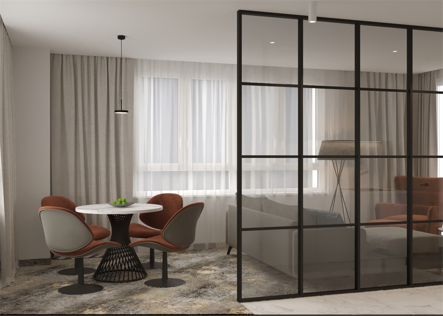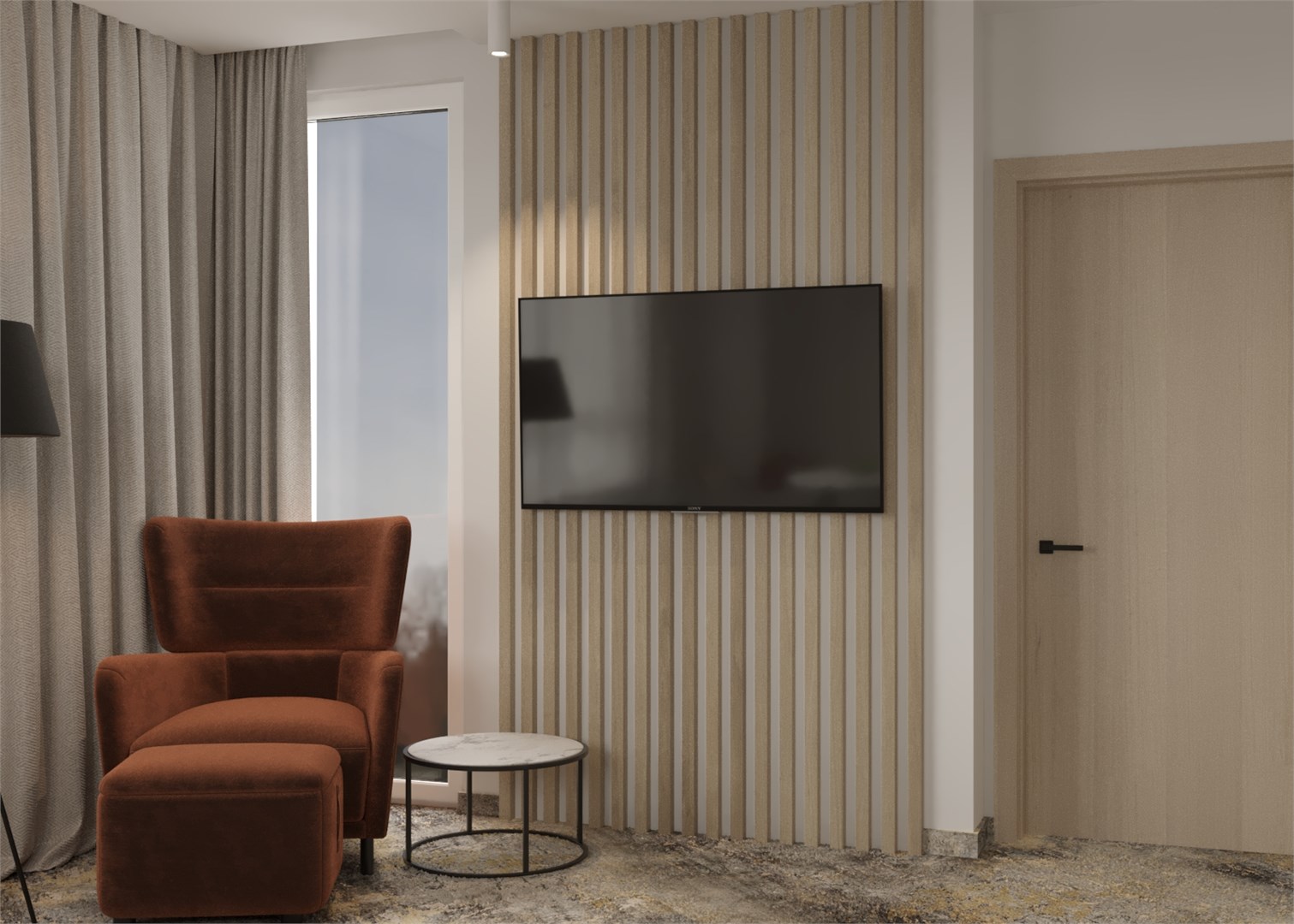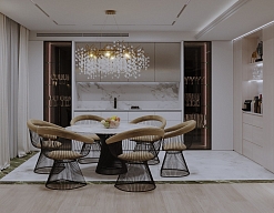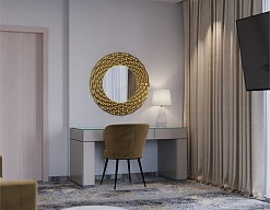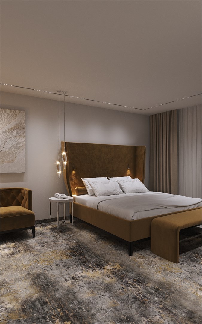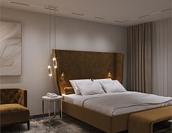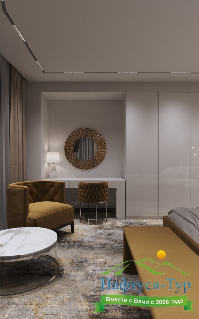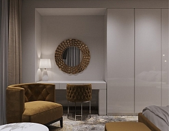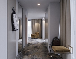 вешалка, гардеробная, диван, зеркало, кресла, кровать двуспальная, прикроватные тумбочки, стол, стул, тумба багажная, шкаф