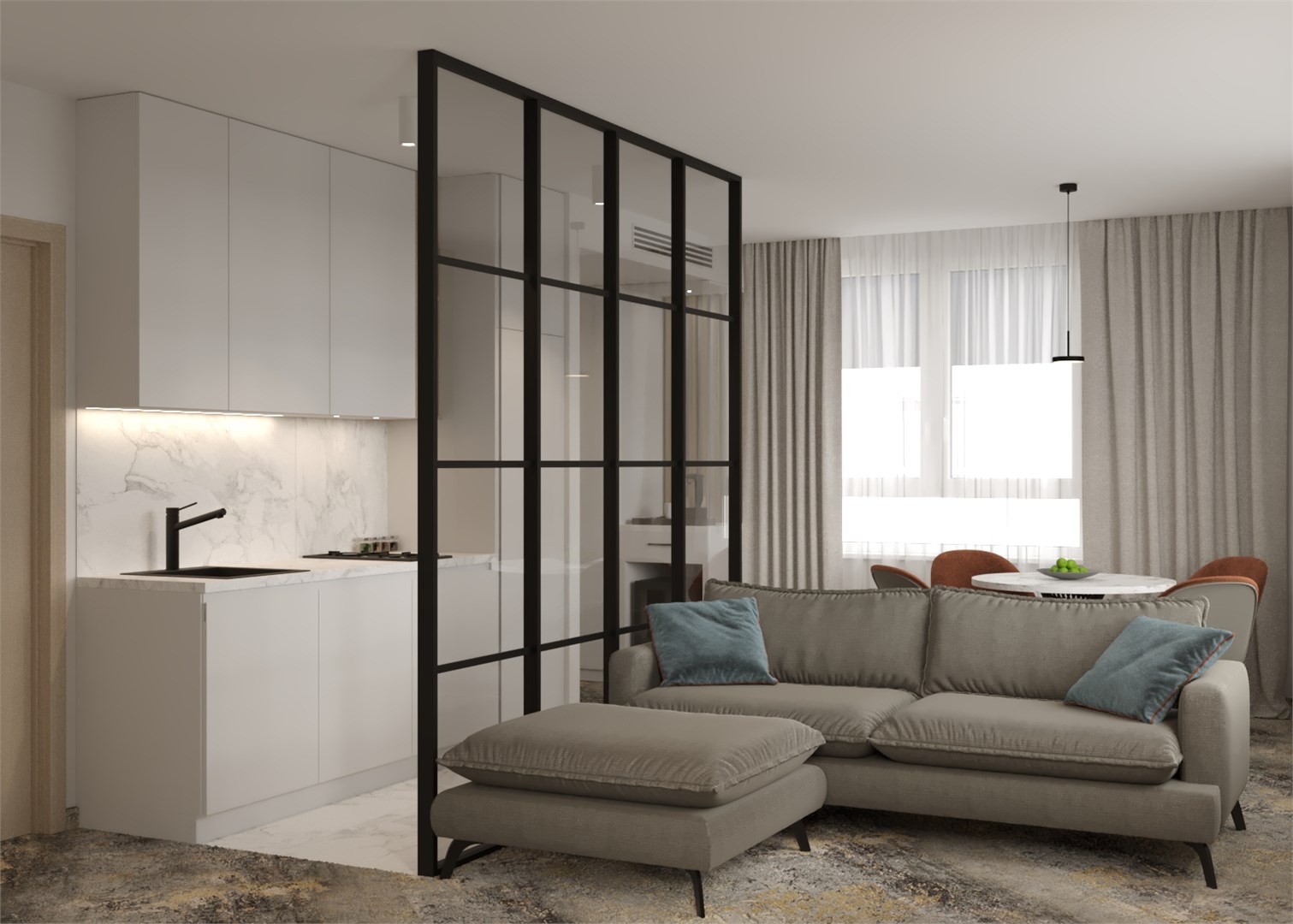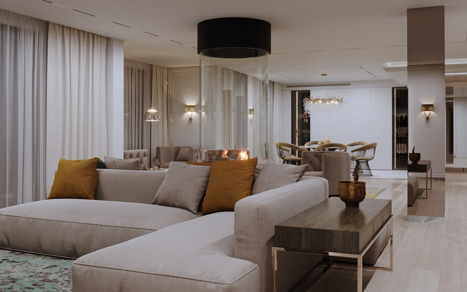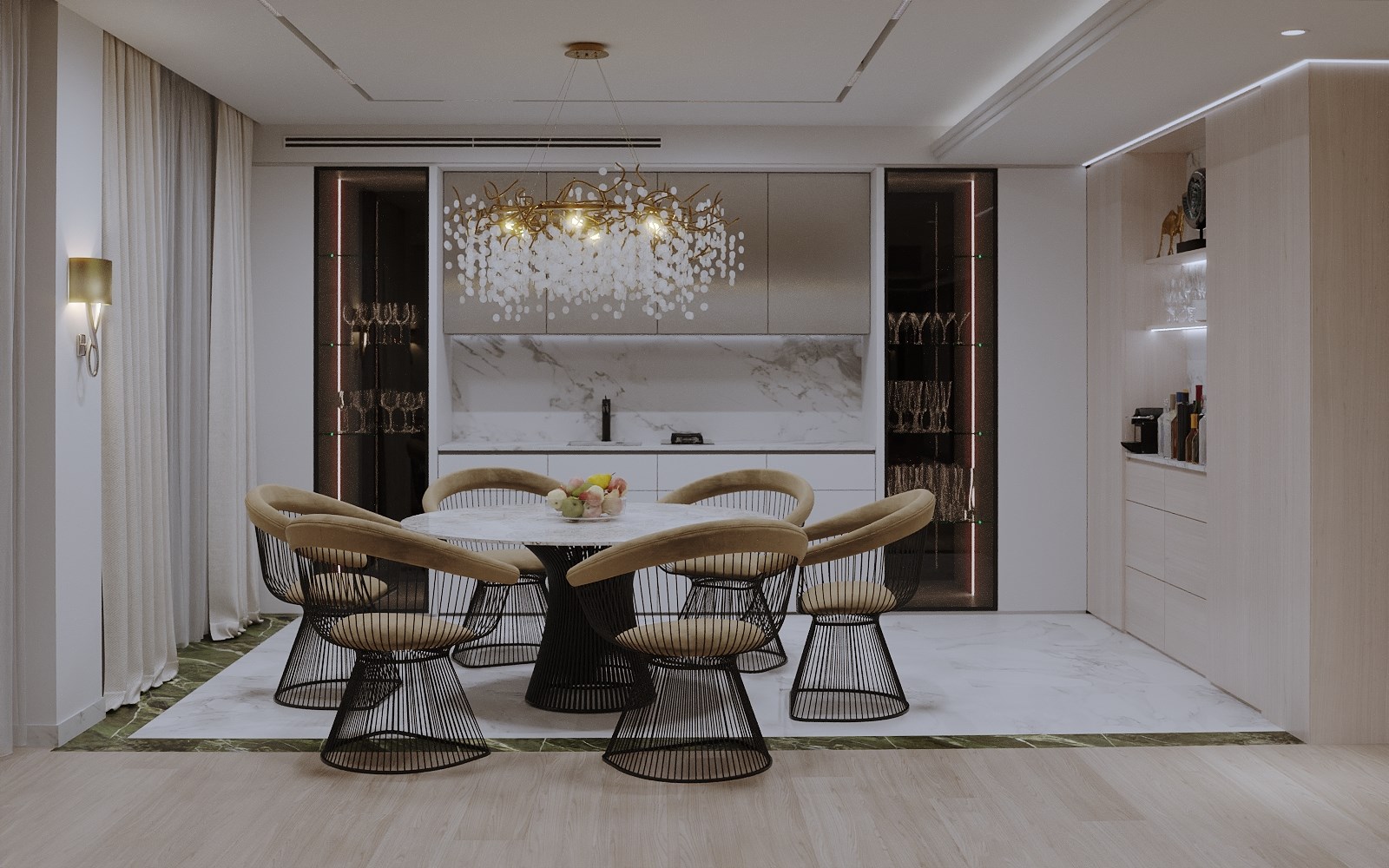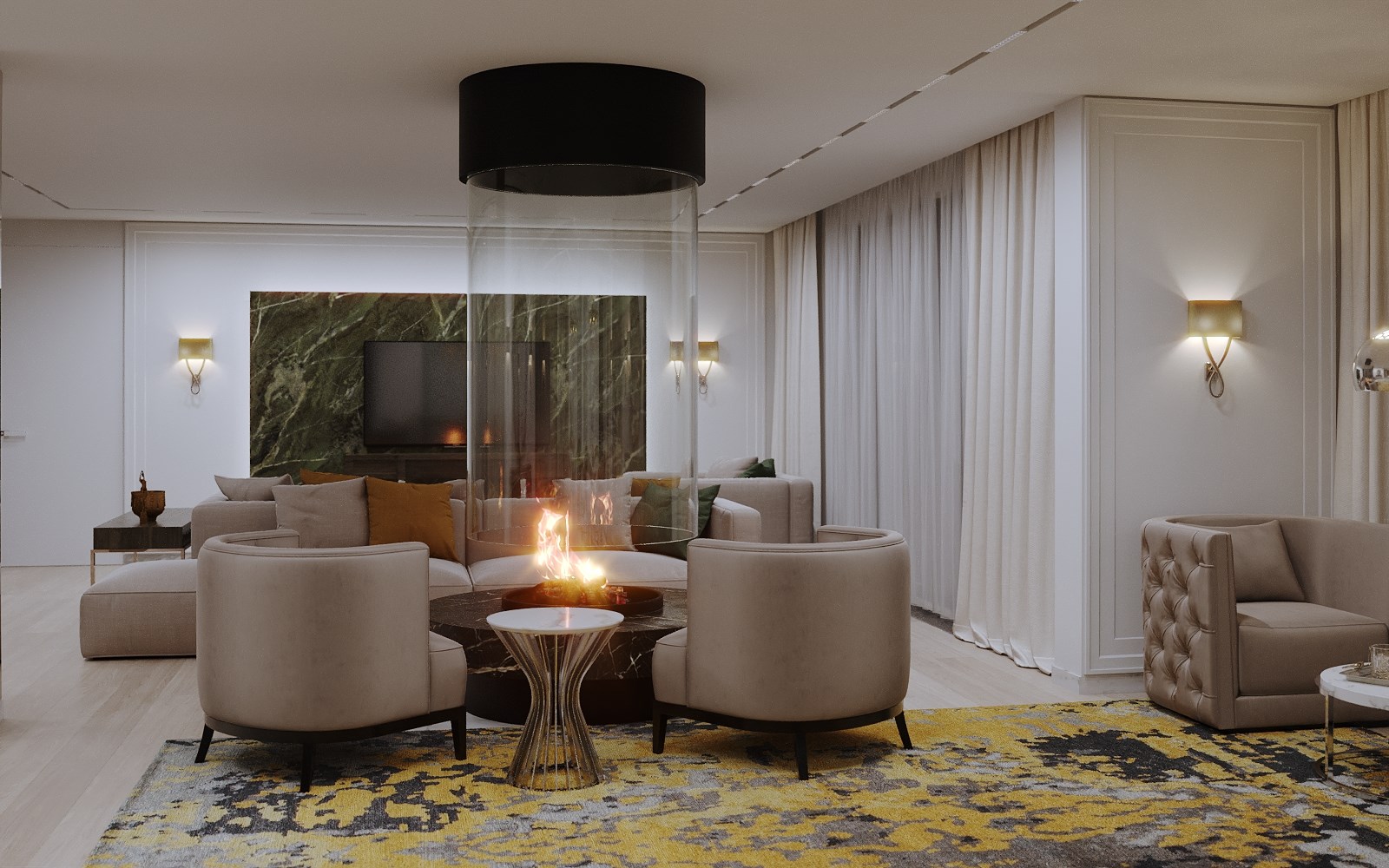 вешалка, гардеробная, диван, зеркало, кресла, кровать двуспальная, прикроватные тумбочки, стол, стул, тумба багажная, шкаф