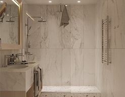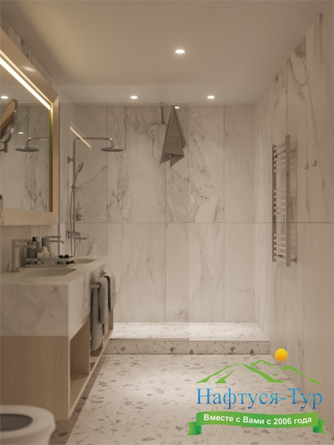 с ванной, тапочки, туалетные принадлежности, фен, халат